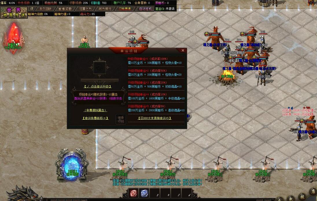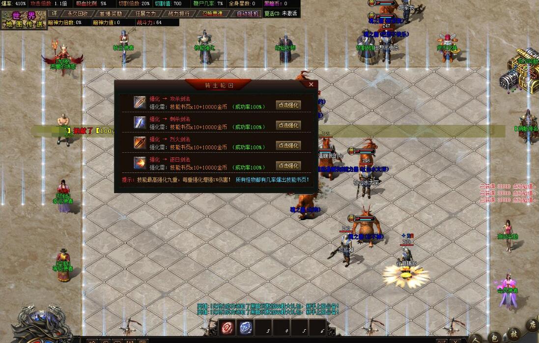 - 排行捐献(封顶1000大米,等于充值100元):切割、爆率、鞭尸、生命、超级属性:30%几率切割+11111,打专属必备!