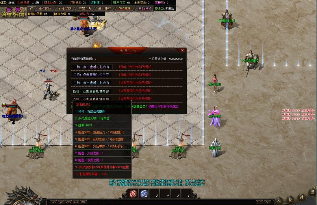 - 五级会员(累充200元宝或黑暗币购买):激活攻速、爆率、回收等大量福利!
