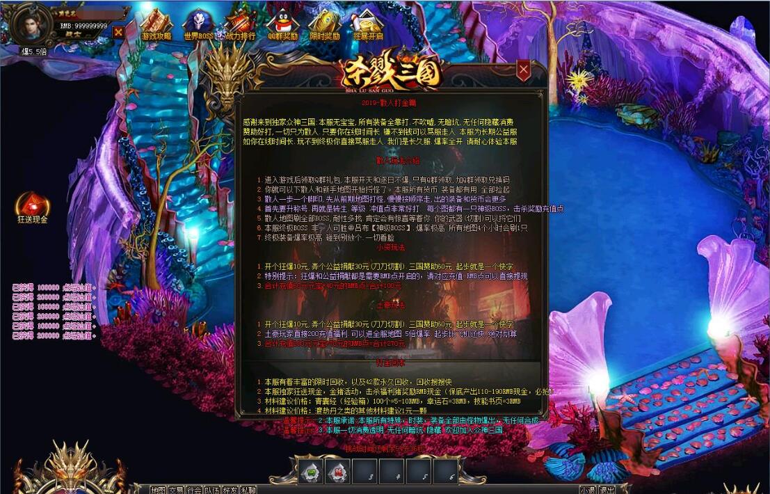本服还原干净聊天框,无垃圾信息及回收提示,商铺不售材料全靠打怪,永久回收物品均由怪物爆出。游戏问题可QQ群联系客服完美解答,无论是否消费均用心服务,所有玩家公平对待。交易安全需通过商铺RMB点交易,提现手续费仅10%;私下交易一经查实封号并清除提现记录;禁止自动刷屏、骂人小号占安全区,违者警告或封号;严禁加速脱机外挂,发现必删永不解封。