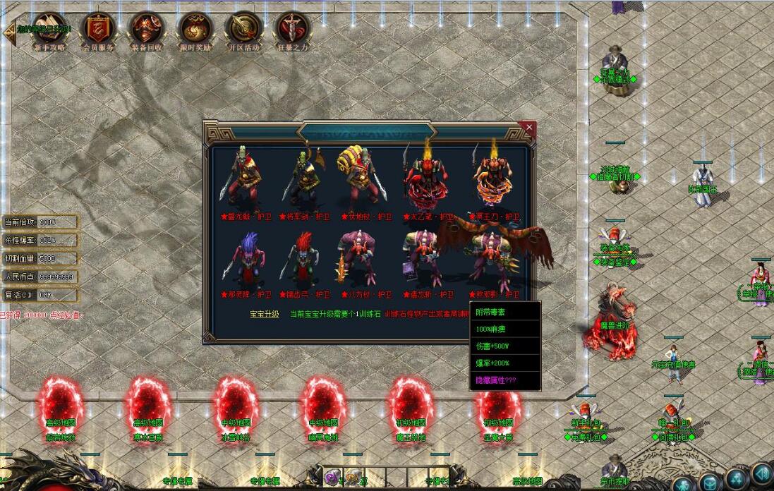 游戏分为等级宝宝、转生宝宝和魔兽宝宝三种类型,所有宝宝都可以免费获取,即使不花钱也一样强大。默认情况下,宝宝数量最多为3只,但是可以通过卡等级和转生来提高上限。