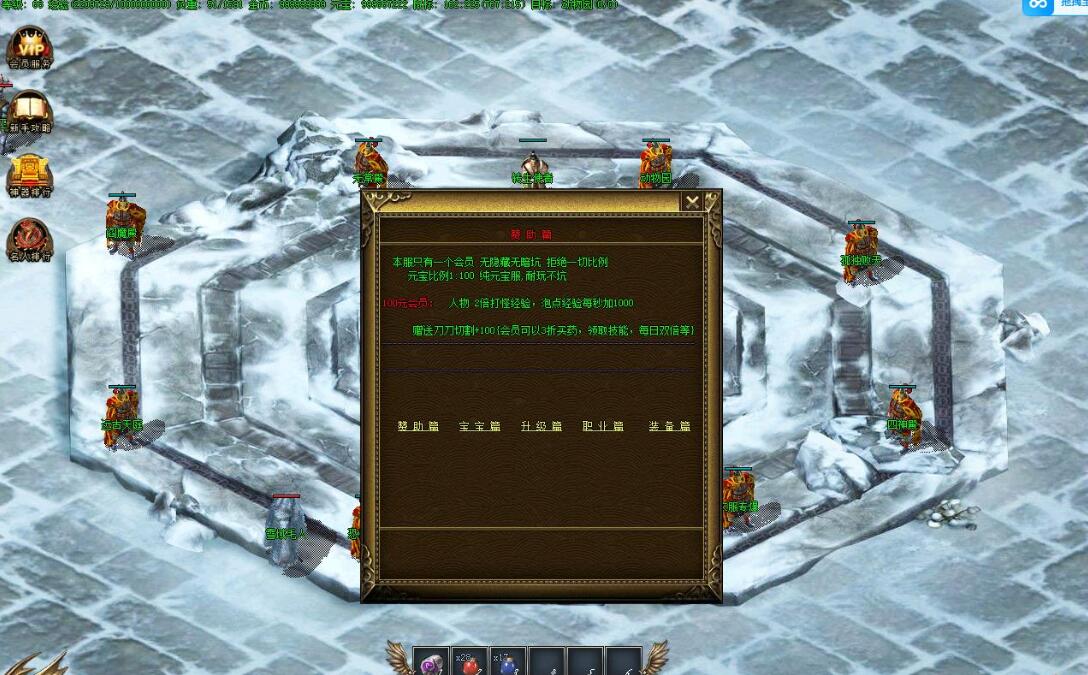 本服还原干净聊天框,无垃圾信息及回收提示,商铺不售材料全靠打怪,永久回收物品均由怪物爆出。游戏问题可QQ群联系客服完美解答,无论是否消费均用心服务,所有玩家公平对待。交易安全需通过商铺RMB点交易,提现手续费仅10%;私下交易一经查实封号并清除提现记录;禁止自动刷屏、骂人小号占安全区,违者警告或封号;严禁加速脱机外挂,发现必删永不解封。