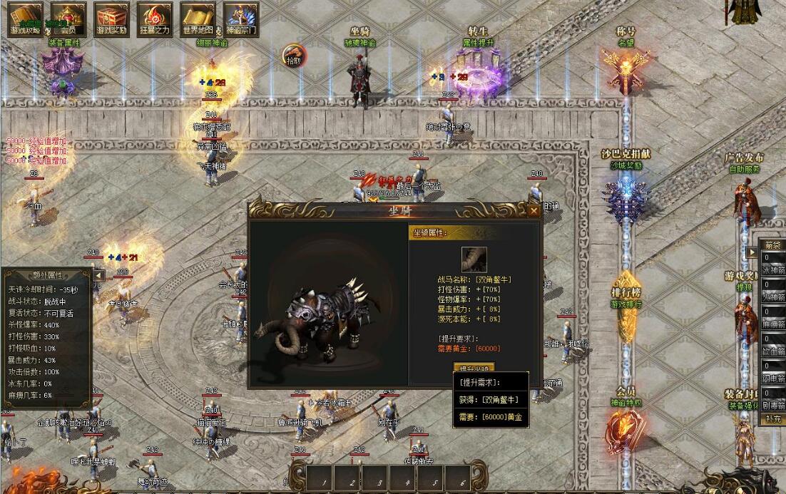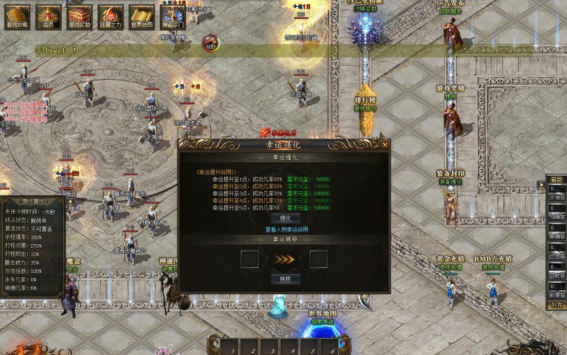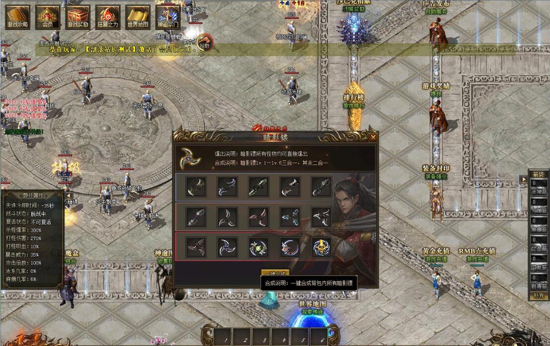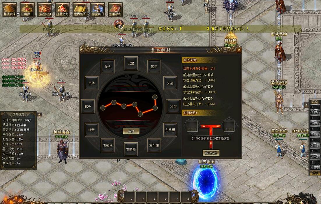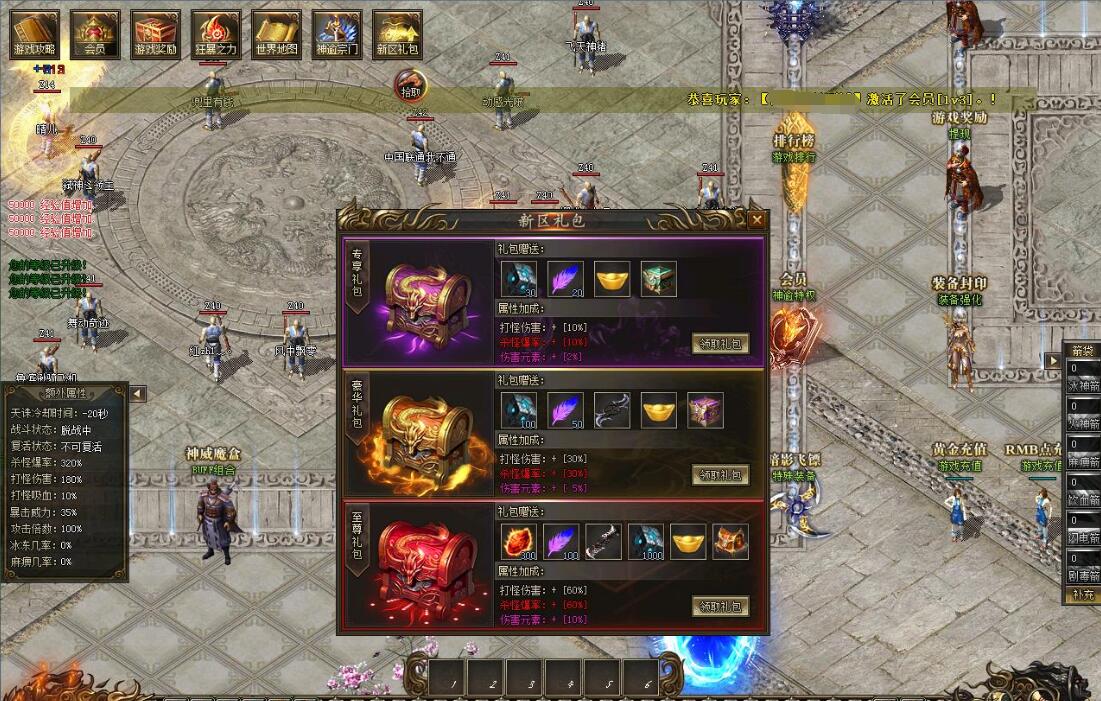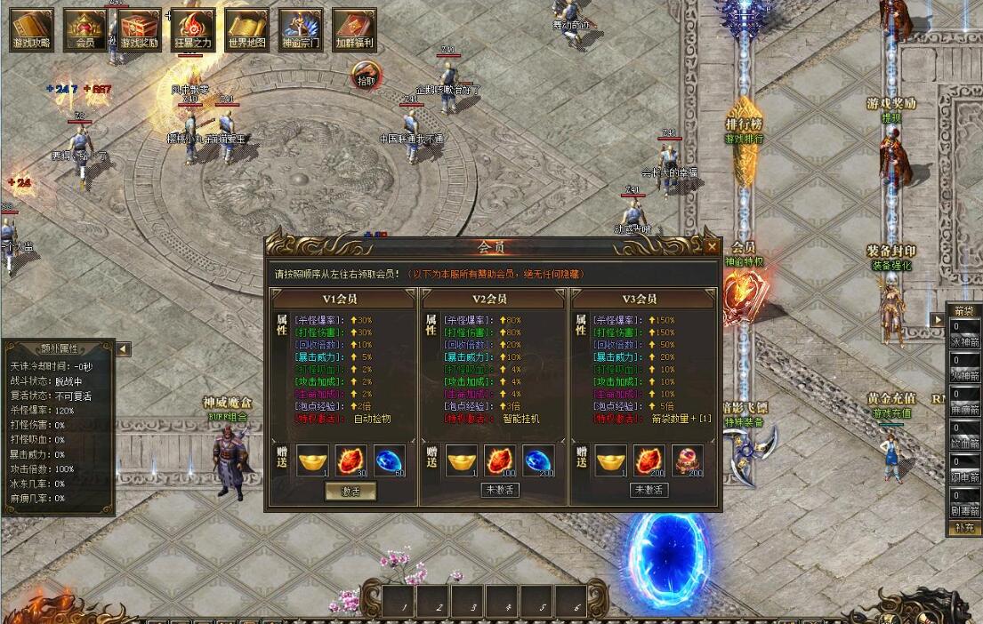 V2会员:248元黄金充值:激活自动挂机 杀怪爆率+80% 打怪伤害+80% 回收倍率+20%等神秘属性!