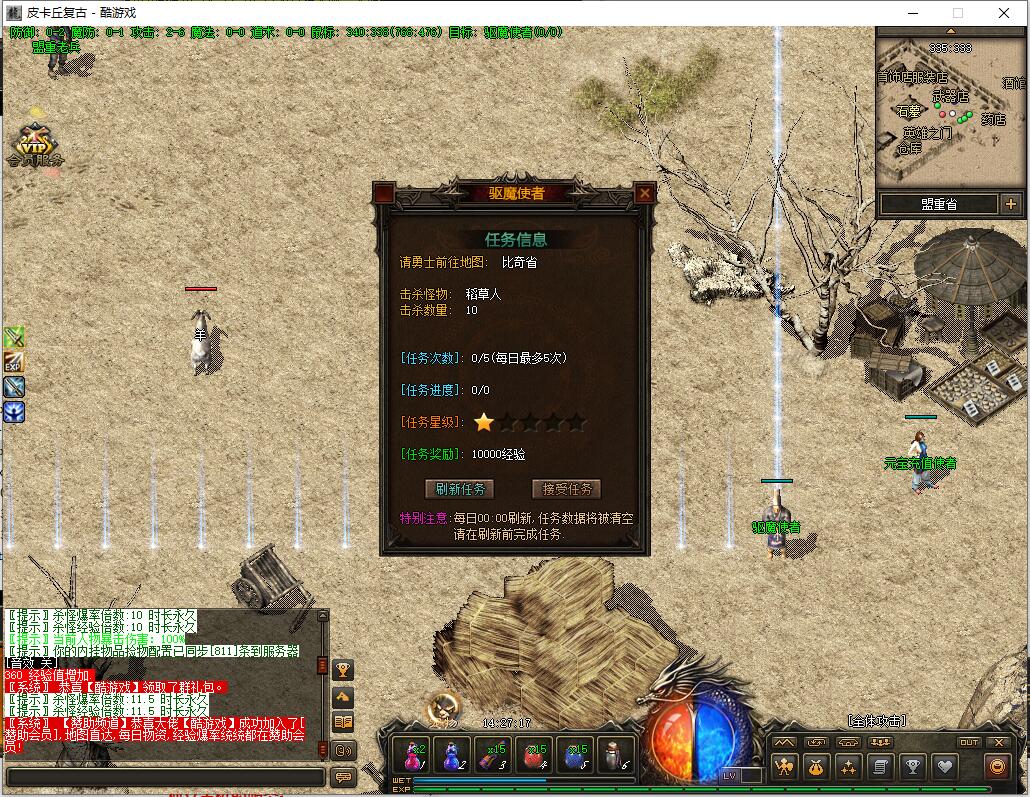 杀猫逐鹿出新村 斩妖除魔入盟重 近观绿涛汇碧海 远眺青山有苍松