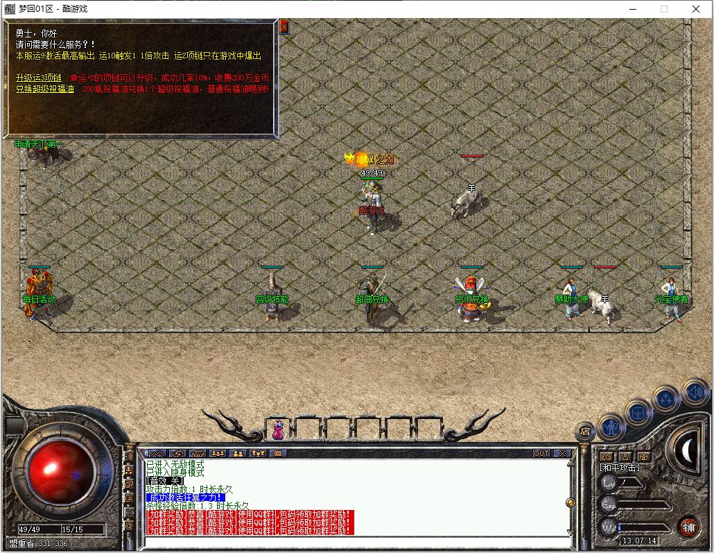 传奇游戏最新版本更新:新增智能挂机系统(入口位于综合服务内),优化所有怪物爆率(专属与材料爆率大幅提升),新增三个不爆物品,同步上线手写攻略(建议配合查询系统游玩,游戏难度适中)。增加元宝获取途径(杀怪即可获得元宝,适配后期高消耗需求),新增两个背包神器,调整金币获取规则(不同赞助等级对应不同获取量),金币回收倍率与赞助等级挂钩。修复3个剧情地图因不刷怪导致的中断问题,解决强化框不显示无法强化的故障,优化杀怪点变量及称号领取条件(一晚上可领完)。整理土城NPC布局(删除无用NPC,界面更整洁),新增GM可控真假爆率系统,优化人物初始攻速(非无限刀)。完成多处剧情地图问题修复与优化:赤沙龙城材料调整;剧情二四个NPC货币消耗、材料及概率优化(适配周服节奏);剧情三老者/尊者材料数量与成功率优化、老马猴/卖酒老头/定海神针合成修改、震天凯/穿针引线合成问题修复;云顶天宫进图条件调整,难度适当降低。