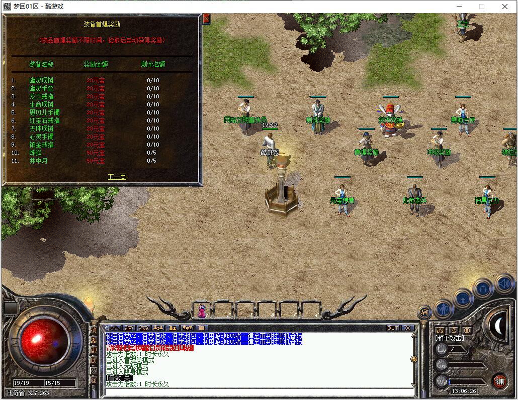 正式区各职业达到42级,前三名各奖励100元!首次攻沙总人数达60人,奖励1888元!