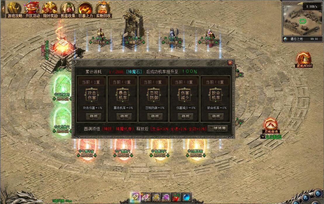 《神魔战场》是一款充满热血与激情的传奇游戏,元神系统作为核心特色玩法,拥有强大耐玩性与探索性,是散人玩家逆袭高富帅的快捷之路。游戏包含元神系统(青龙、白虎、朱雀、玄武元神,满级120级,玄武元神可学阴阳召唤召唤同步属性宝宝,材料靠打怪大量爆出自动食用)、人物神力·坐骑系统(满级坐骑倍攻+20%、爆率+40%、伤害+20%,9级带传送,灵魂宝石与元宝靠打怪)、强力元素·称号系统(满级称号攻+10%、体力+10%、魔力+10%、致命+10%、暴击抗+10%,顶级激活护体神盾,材料靠打怪),以及泰亚史诗特色玩法(幸运最高12激活刀刀最高攻击,武器准确+30,前100级经验卷打怪,后120级埋没之城副本,青铜赞助以上可紫装鉴定)。长期玩法耐玩,助玩家在神魔战场脱颖而出。
