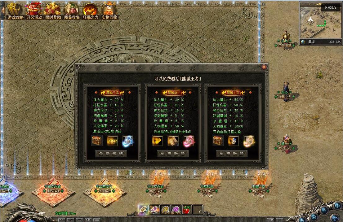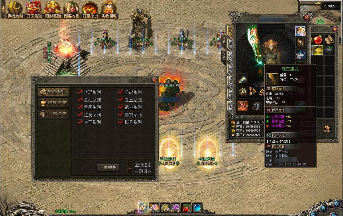 传奇游戏最新版本更新:新增智能挂机系统(入口位于综合服务内),优化所有怪物爆率(专属与材料爆率大幅提升),新增三个不爆物品,同步上线手写攻略(建议配合查询系统游玩,游戏难度适中)。增加元宝获取途径(杀怪即可获得元宝,适配后期高消耗需求),新增两个背包神器,调整金币获取规则(不同赞助等级对应不同获取量),金币回收倍率与赞助等级挂钩。修复3个剧情地图因不刷怪导致的中断问题,解决强化框不显示无法强化的故障,优化杀怪点变量及称号领取条件(一晚上可领完)。整理土城NPC布局(删除无用NPC,界面更整洁),新增GM可控真假爆率系统,优化人物初始攻速(非无限刀)。完成多处剧情地图问题修复与优化:赤沙龙城材料调整;剧情二四个NPC货币消耗、材料及概率优化(适配周服节奏);剧情三老者/尊者材料数量与成功率优化、老马猴/卖酒老头/定海神针合成修改、震天凯/穿针引线合成问题修复;云顶天宫进图条件调整,难度适当降低。