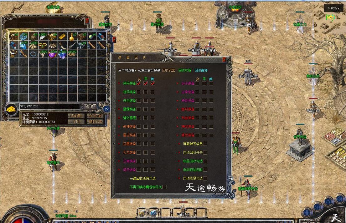 传奇游戏最新版本更新:新增智能挂机系统(入口位于综合服务内),优化所有怪物爆率(专属与材料爆率大幅提升),新增三个不爆物品,同步上线手写攻略(建议配合查询系统游玩,游戏难度适中)。增加元宝获取途径(杀怪即可获得元宝,适配后期高消耗需求),新增两个背包神器,调整金币获取规则(不同赞助等级对应不同获取量),金币回收倍率与赞助等级挂钩。修复3个剧情地图因不刷怪导致的中断问题,解决强化框不显示无法强化的故障,优化杀怪点变量及称号领取条件(一晚上可领完)。整理土城NPC布局(删除无用NPC,界面更整洁),新增GM可控真假爆率系统,优化人物初始攻速(非无限刀)。完成多处剧情地图问题修复与优化:赤沙龙城材料调整;剧情二四个NPC货币消耗、材料及概率优化(适配周服节奏);剧情三老者/尊者材料数量与成功率优化、老马猴/卖酒老头/定海神针合成修改、震天凯/穿针引线合成问题修复;云顶天宫进图条件调整,难度适当降低。