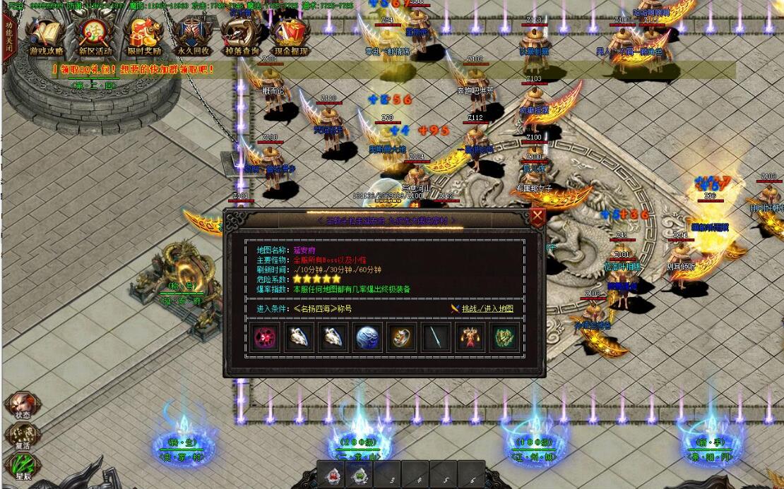 - 所有地图都有几率爆出"保值装备",二大陆、四大陆、七大陆、八大陆定点刷新Boss<(10分钟)