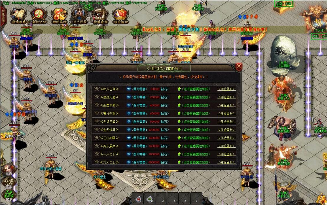 - 所有怪物打死后都会增加杀怪值<(后期强化自身属性)>,小怪和普通Boss打死增加好汉值<(副本进图开宝箱必备)>