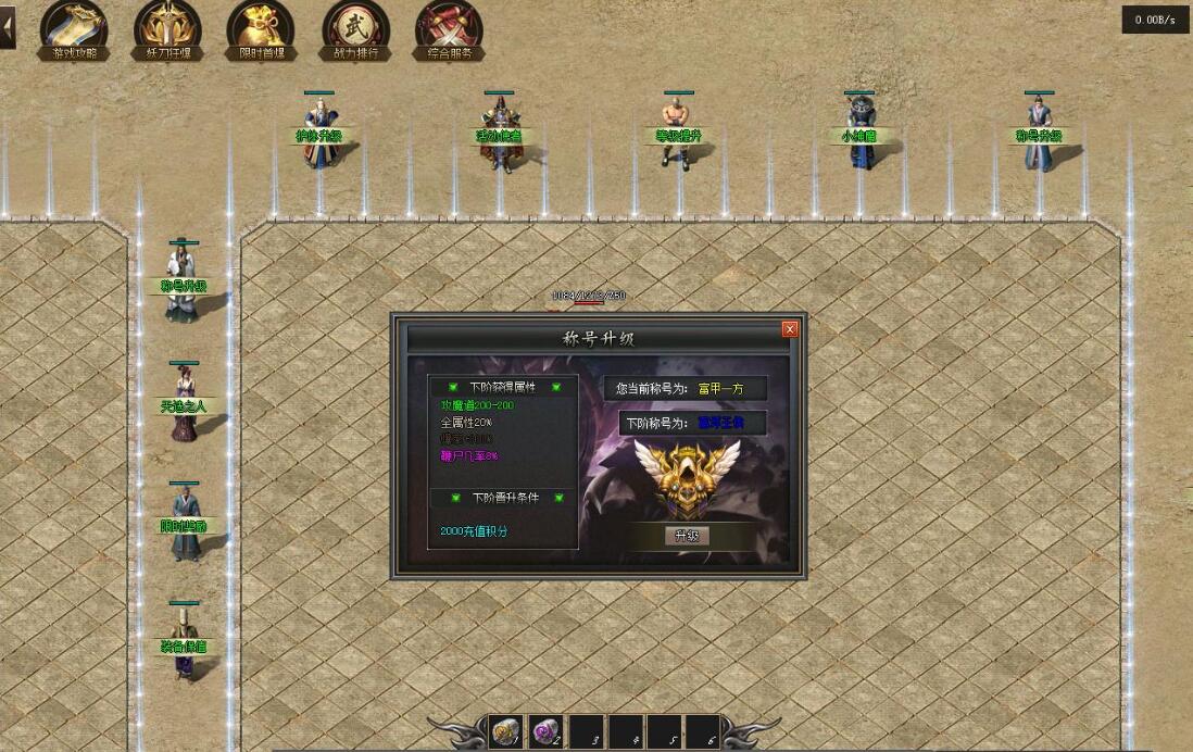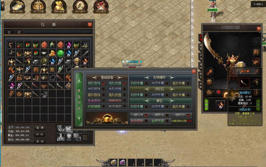 传奇游戏最新版本更新:新增智能挂机系统(入口位于综合服务内),优化所有怪物爆率(专属与材料爆率大幅提升),新增三个不爆物品,同步上线手写攻略(建议配合查询系统游玩,游戏难度适中)。增加元宝获取途径(杀怪即可获得元宝,适配后期高消耗需求),新增两个背包神器,调整金币获取规则(不同赞助等级对应不同获取量),金币回收倍率与赞助等级挂钩。修复3个剧情地图因不刷怪导致的中断问题,解决强化框不显示无法强化的故障,优化杀怪点变量及称号领取条件(一晚上可领完)。整理土城NPC布局(删除无用NPC,界面更整洁),新增GM可控真假爆率系统,优化人物初始攻速(非无限刀)。完成多处剧情地图问题修复与优化:赤沙龙城材料调整;剧情二四个NPC货币消耗、材料及概率优化(适配周服节奏);剧情三老者/尊者材料数量与成功率优化、老马猴/卖酒老头/定海神针合成修改、震天凯/穿针引线合成问题修复;云顶天宫进图条件调整,难度适当降低。