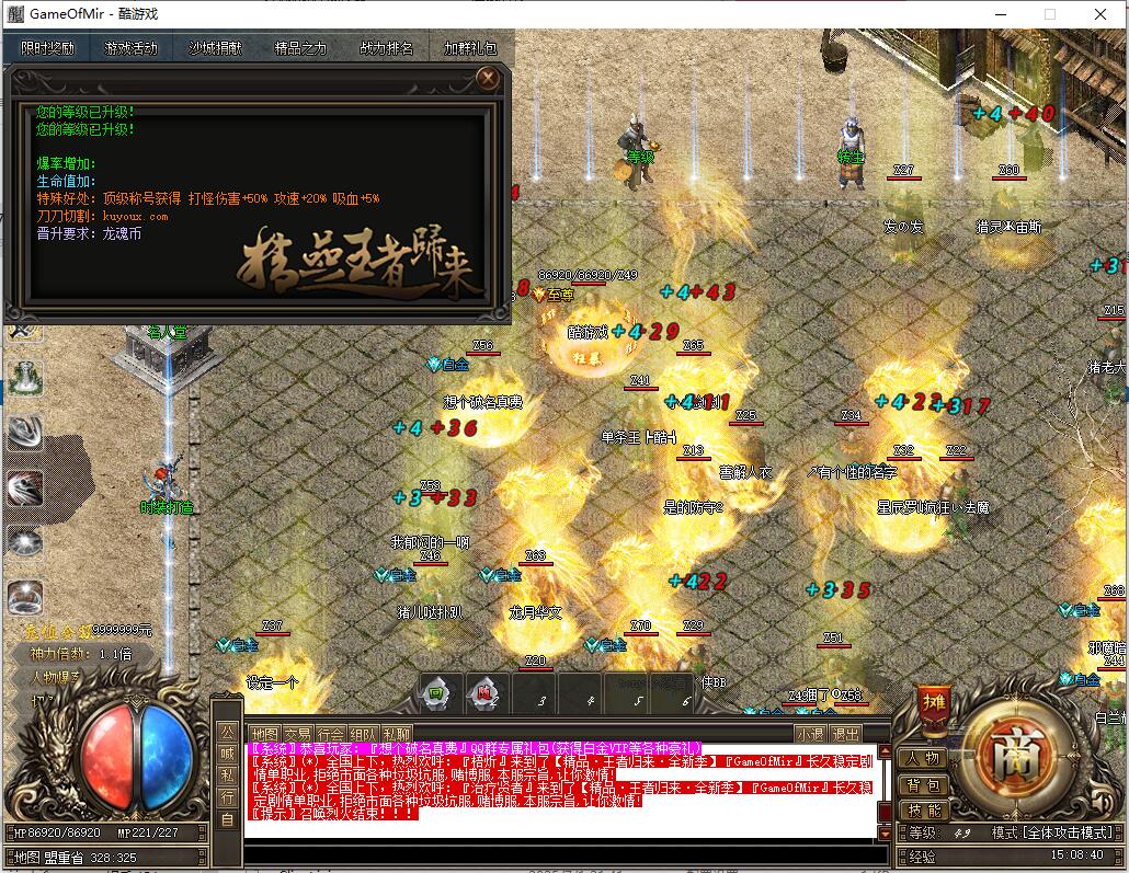 VIP打怪概率触发会员专属BUFF,新人可获得刀刀冰冻效果。散人玩家务必加入QQ群领取白金VIP,免验证QQ群:修改所有怪物爆率,增加金猪送礼和金蛋送礼,可爆初级起步时装;沙城捐献可提升爆率、血量及刀刀切割,详情见NPC,不喜欢切割提示可打开会员服务关闭;暴走玩家可通过会员服务开启开屏捡物和自动回收,节省时间赢在起跑线;新增鬼器S级套装、鬼级MAX套装、S级四格和SS级四格。