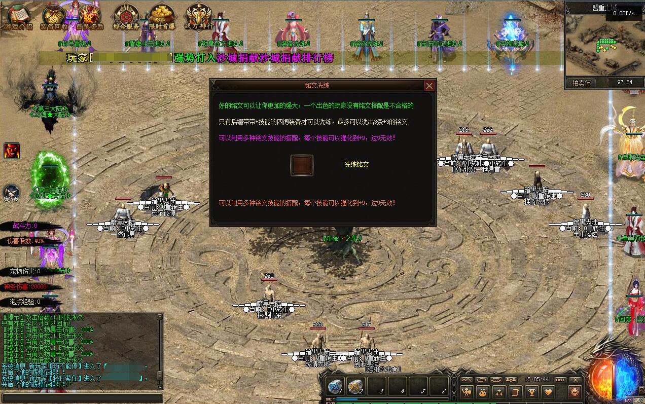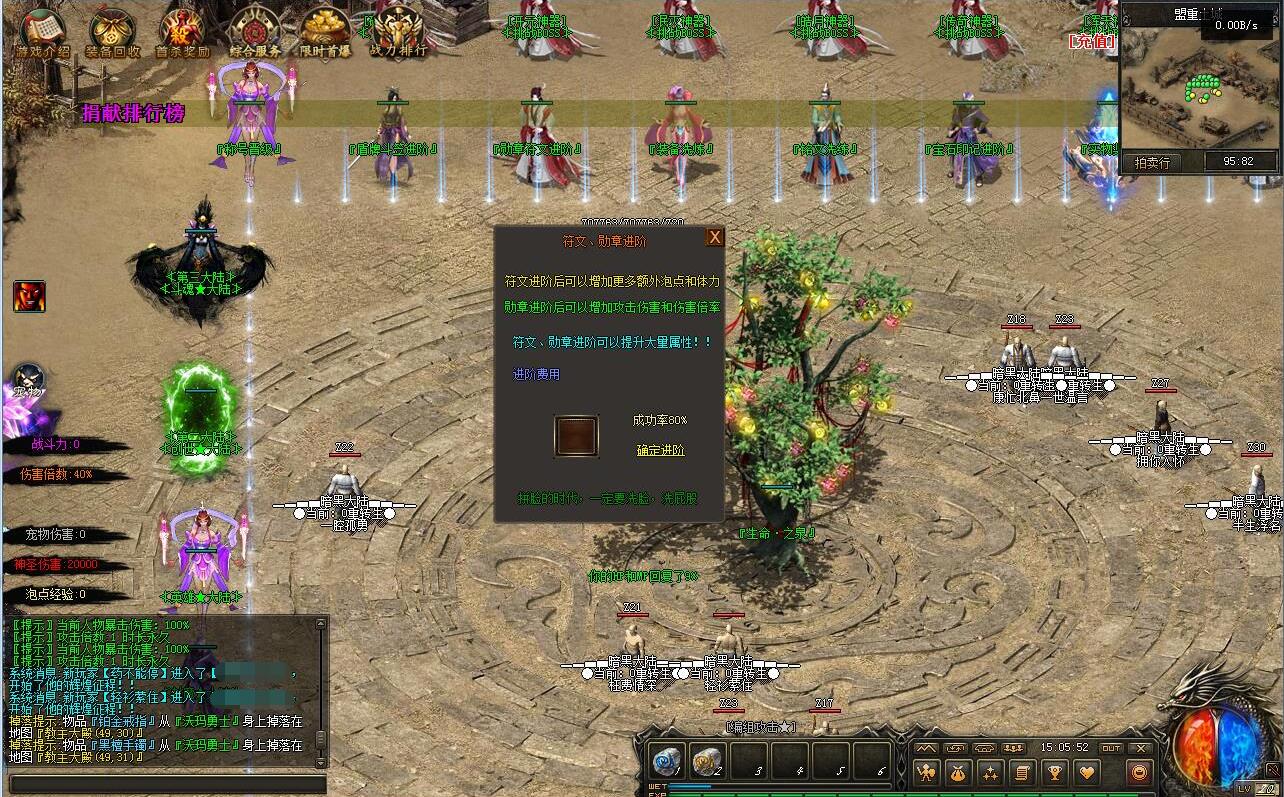 - 创世大陆:隐藏地图→深海迷渊→卡尔蒂姆→扭曲之地→希望之园→巨龙巢穴→骸骨祭坛→迷幻空→流放大陆 (爆出1转专属装备→时装专属→生肖)