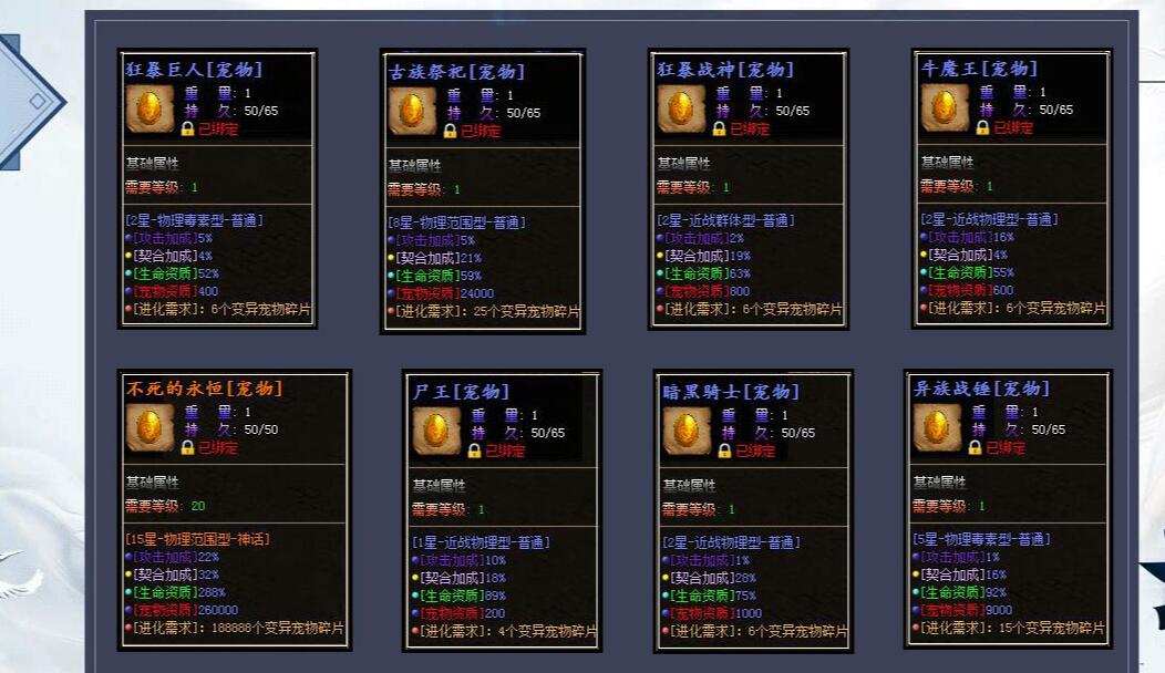 - 攻击加成%:如资质2万,加成50%,召唤宠物攻击就是3万;加成100%就是4万