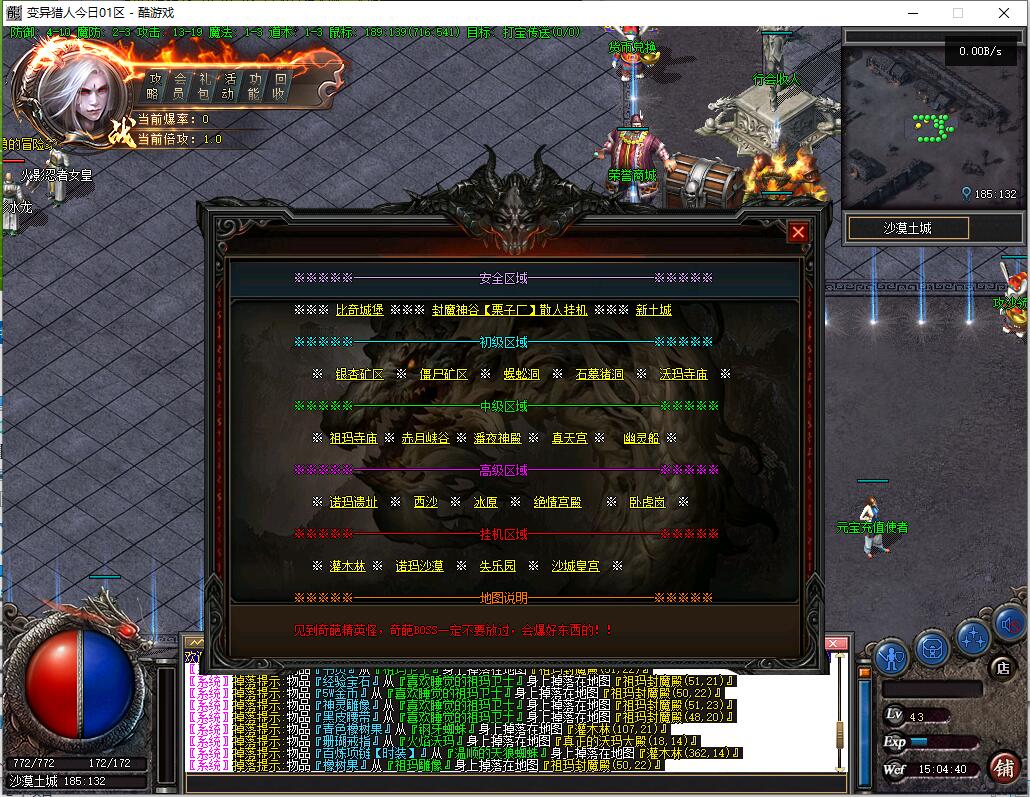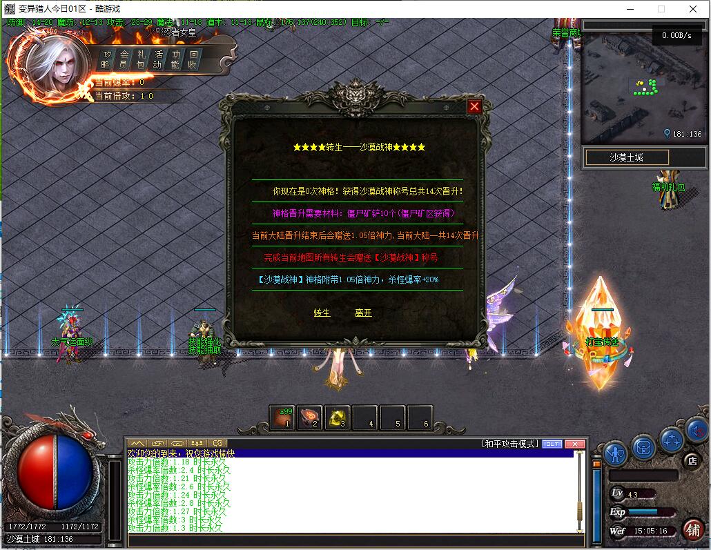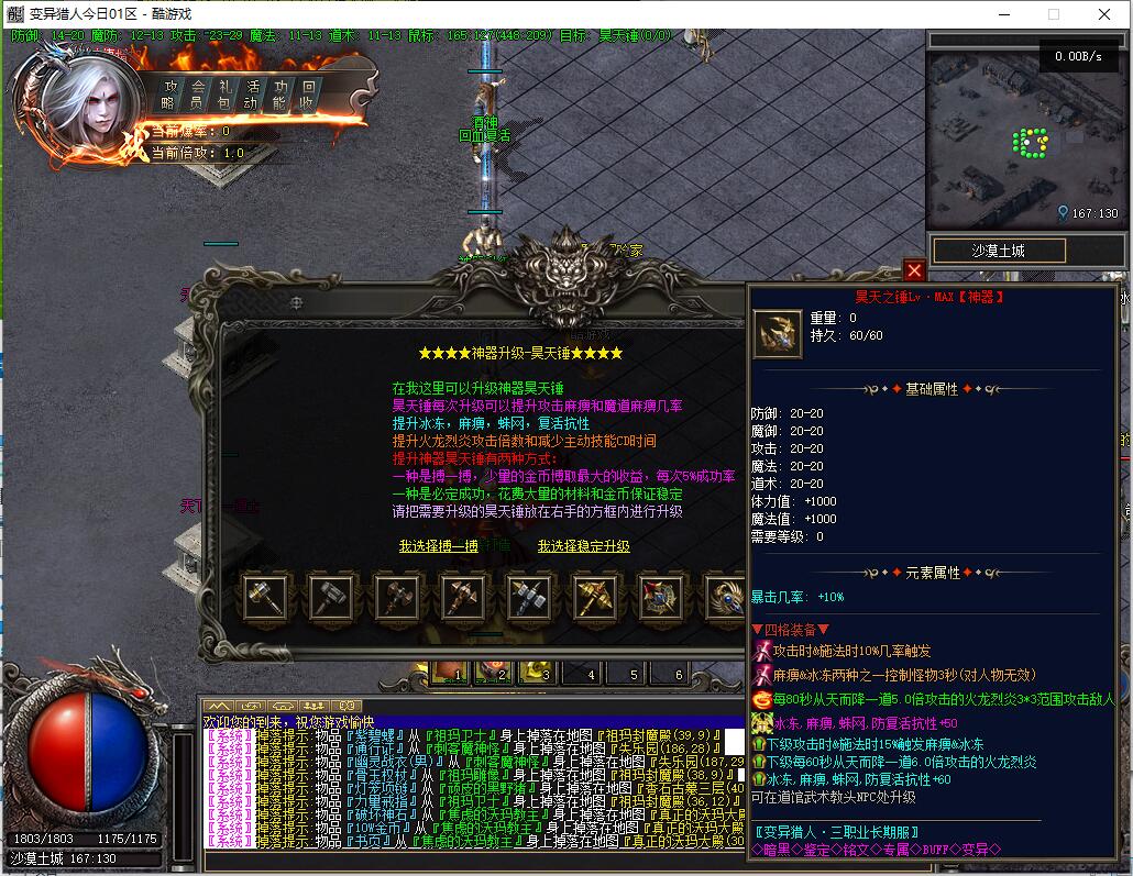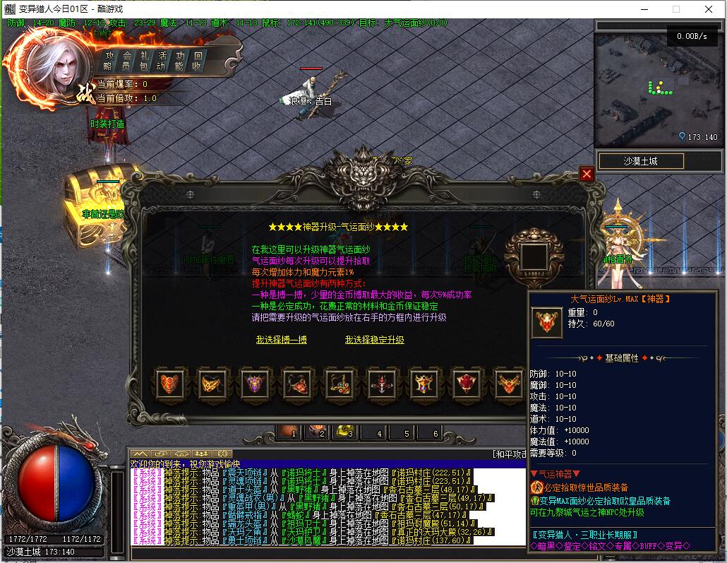 传奇游戏最新版本更新:新增智能挂机系统(入口位于综合服务内),优化所有怪物爆率(专属与材料爆率大幅提升),新增三个不爆物品,同步上线手写攻略(建议配合查询系统游玩,游戏难度适中)。增加元宝获取途径(杀怪即可获得元宝,适配后期高消耗需求),新增两个背包神器,调整金币获取规则(不同赞助等级对应不同获取量),金币回收倍率与赞助等级挂钩。修复3个剧情地图因不刷怪导致的中断问题,解决强化框不显示无法强化的故障,优化杀怪点变量及称号领取条件(一晚上可领完)。整理土城NPC布局(删除无用NPC,界面更整洁),新增GM可控真假爆率系统,优化人物初始攻速(非无限刀)。完成多处剧情地图问题修复与优化:赤沙龙城材料调整;剧情二四个NPC货币消耗、材料及概率优化(适配周服节奏);剧情三老者/尊者材料数量与成功率优化、老马猴/卖酒老头/定海神针合成修改、震天凯/穿针引线合成问题修复;云顶天宫进图条件调整,难度适当降低。