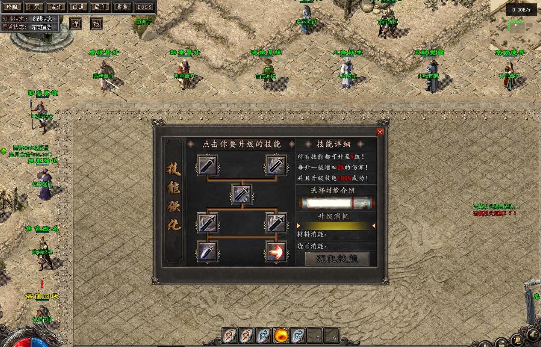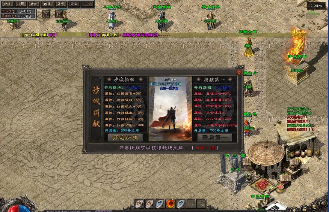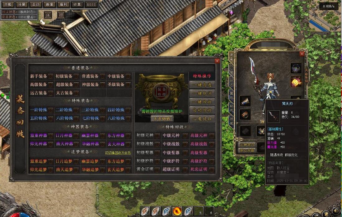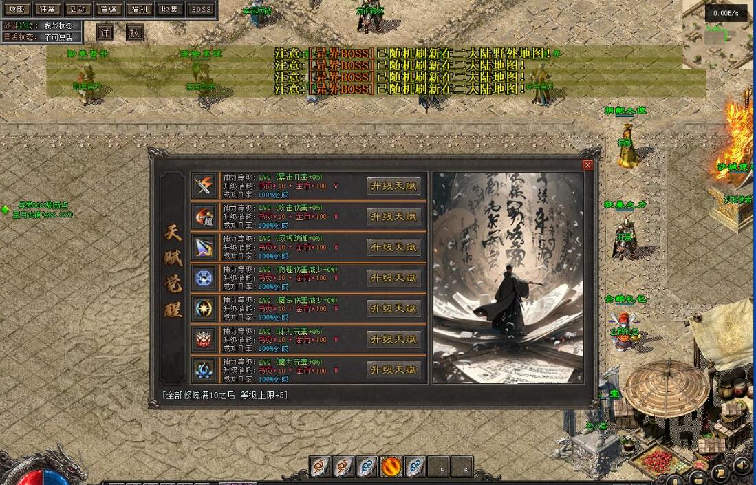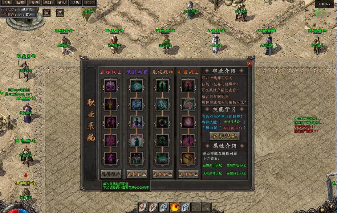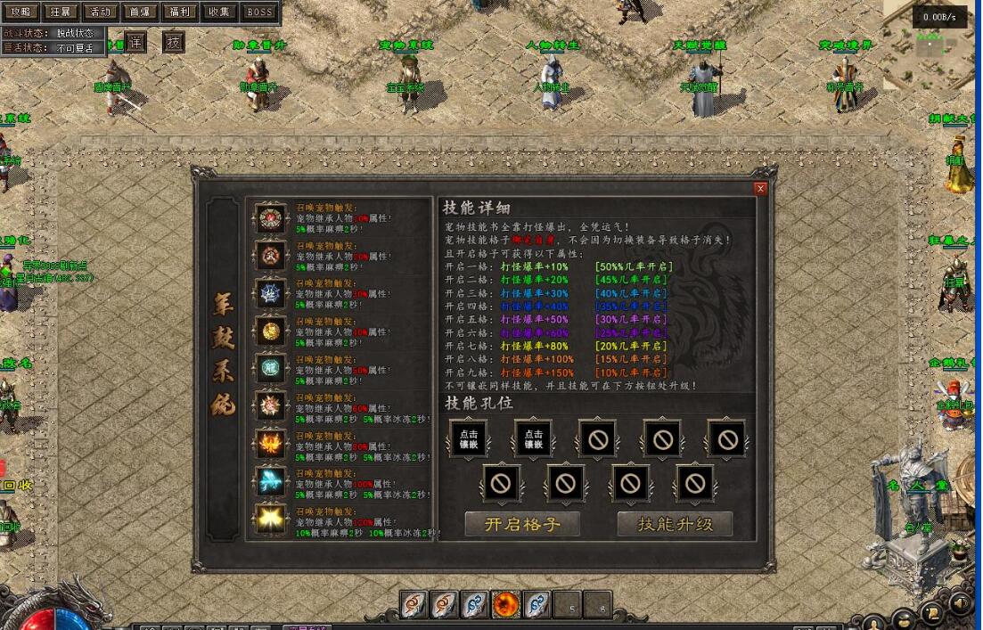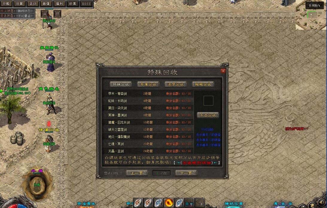 测试爆率设置为10000,群服建议设置为1000~2000。游戏功能包括:取消回城石读条,设置回城石和随机石无限次数,缩短刷怪时间,10倍怪物,动态刷怪,刀刀货币(根据群服再行设置)。