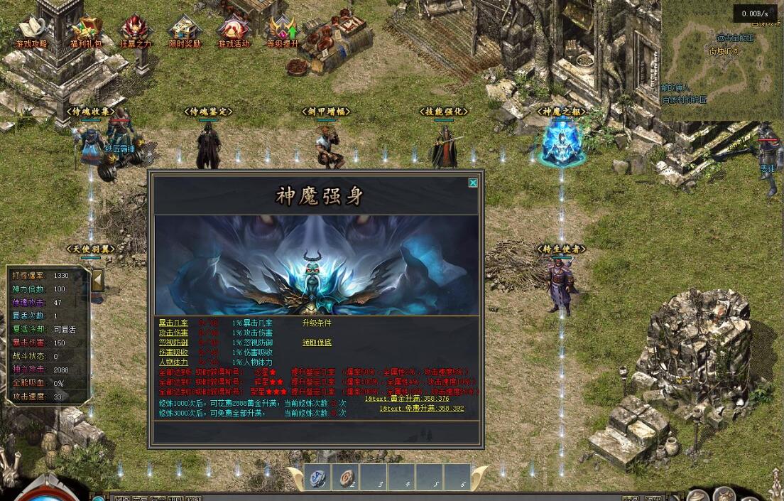 《神魔战场》是一款充满热血与激情的传奇游戏,元神系统作为核心特色玩法,拥有强大耐玩性与探索性,是散人玩家逆袭高富帅的快捷之路。游戏包含元神系统(青龙、白虎、朱雀、玄武元神,满级120级,玄武元神可学阴阳召唤召唤同步属性宝宝,材料靠打怪大量爆出自动食用)、人物神力·坐骑系统(满级坐骑倍攻+20%、爆率+40%、伤害+20%,9级带传送,灵魂宝石与元宝靠打怪)、强力元素·称号系统(满级称号攻+10%、体力+10%、魔力+10%、致命+10%、暴击抗+10%,顶级激活护体神盾,材料靠打怪),以及泰亚史诗特色玩法(幸运最高12激活刀刀最高攻击,武器准确+30,前100级经验卷打怪,后120级埋没之城副本,青铜赞助以上可紫装鉴定)。长期玩法耐玩,助玩家在神魔战场脱颖而出。