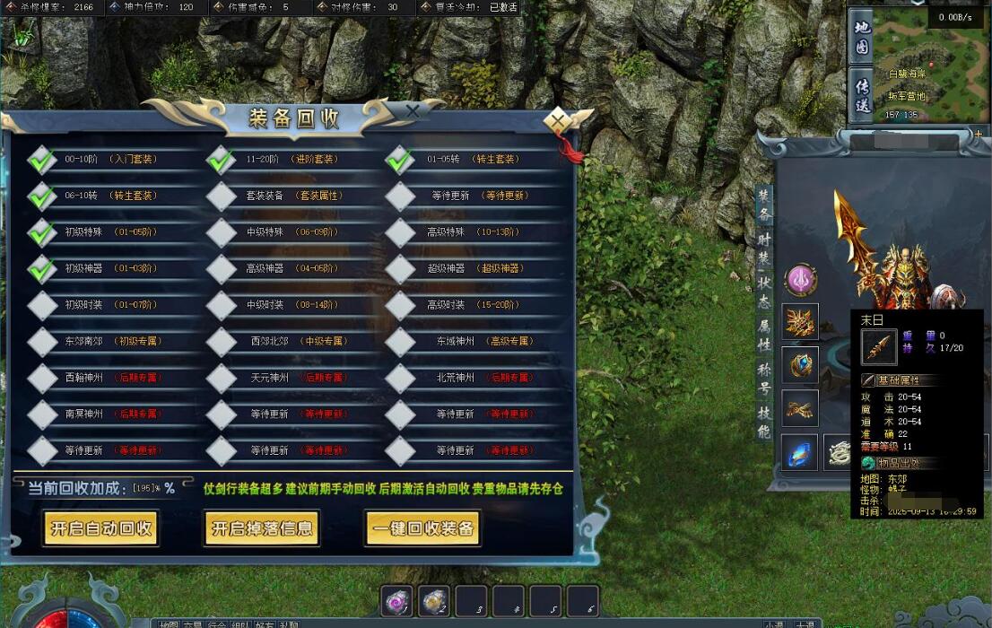 传奇游戏最新版本更新:新增智能挂机系统(入口位于综合服务内),优化所有怪物爆率(专属与材料爆率大幅提升),新增三个不爆物品,同步上线手写攻略(建议配合查询系统游玩,游戏难度适中)。增加元宝获取途径(杀怪即可获得元宝,适配后期高消耗需求),新增两个背包神器,调整金币获取规则(不同赞助等级对应不同获取量),金币回收倍率与赞助等级挂钩。修复3个剧情地图因不刷怪导致的中断问题,解决强化框不显示无法强化的故障,优化杀怪点变量及称号领取条件(一晚上可领完)。整理土城NPC布局(删除无用NPC,界面更整洁),新增GM可控真假爆率系统,优化人物初始攻速(非无限刀)。完成多处剧情地图问题修复与优化:赤沙龙城材料调整;剧情二四个NPC货币消耗、材料及概率优化(适配周服节奏);剧情三老者/尊者材料数量与成功率优化、老马猴/卖酒老头/定海神针合成修改、震天凯/穿针引线合成问题修复;云顶天宫进图条件调整,难度适当降低。