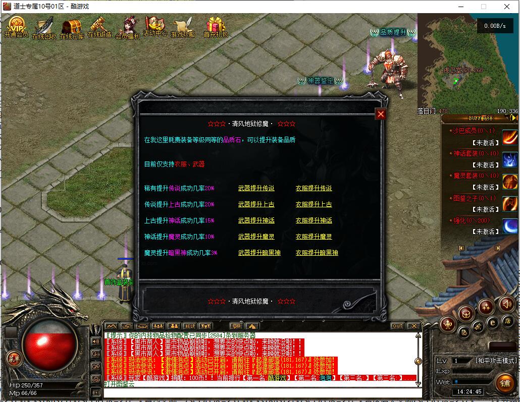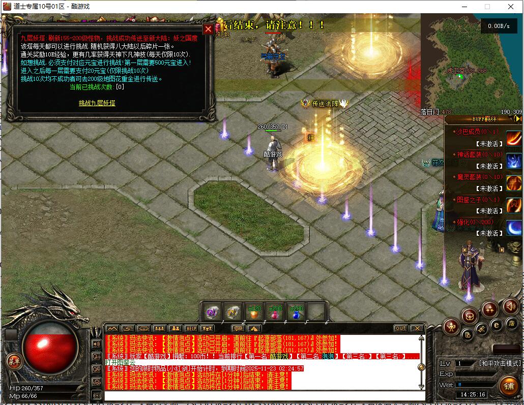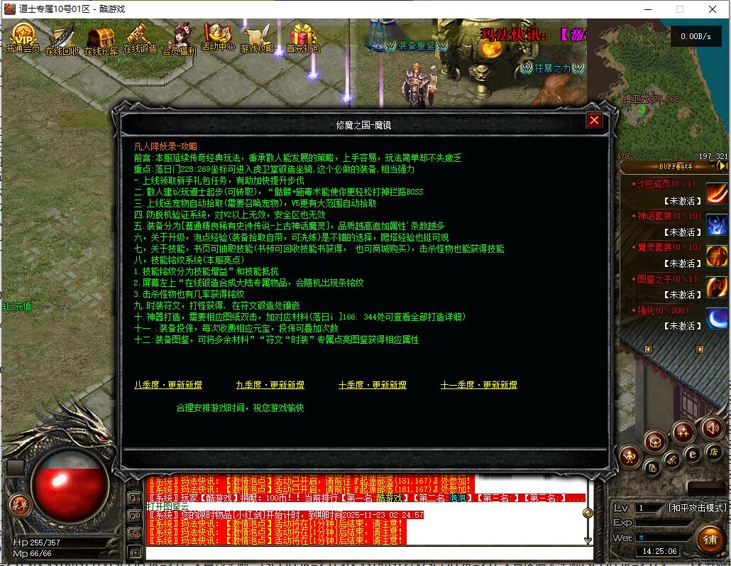 传奇游戏最新版本更新:新增智能挂机系统(入口位于综合服务内),优化所有怪物爆率(专属与材料爆率大幅提升),新增三个不爆物品,同步上线手写攻略(建议配合查询系统游玩,游戏难度适中)。增加元宝获取途径(杀怪即可获得元宝,适配后期高消耗需求),新增两个背包神器,调整金币获取规则(不同赞助等级对应不同获取量),金币回收倍率与赞助等级挂钩。修复3个剧情地图因不刷怪导致的中断问题,解决强化框不显示无法强化的故障,优化杀怪点变量及称号领取条件(一晚上可领完)。整理土城NPC布局(删除无用NPC,界面更整洁),新增GM可控真假爆率系统,优化人物初始攻速(非无限刀)。完成多处剧情地图问题修复与优化:赤沙龙城材料调整;剧情二四个NPC货币消耗、材料及概率优化(适配周服节奏);剧情三老者/尊者材料数量与成功率优化、老马猴/卖酒老头/定海神针合成修改、震天凯/穿针引线合成问题修复;云顶天宫进图条件调整,难度适当降低。