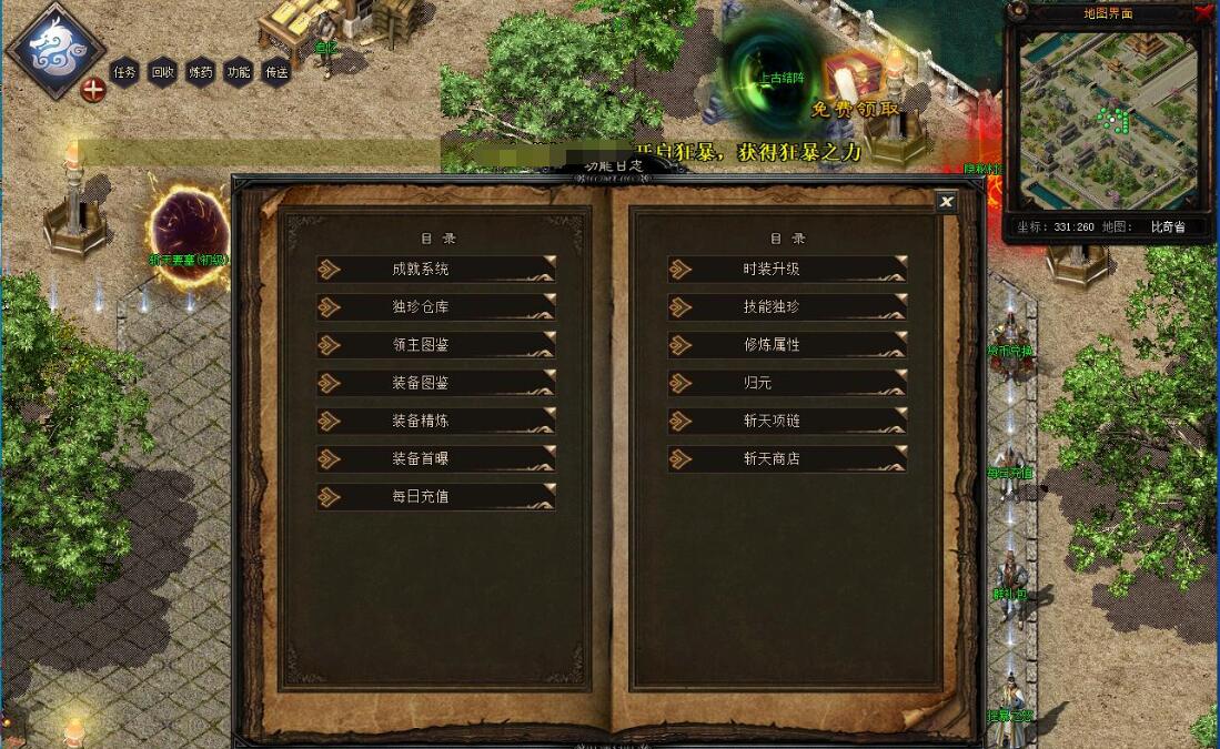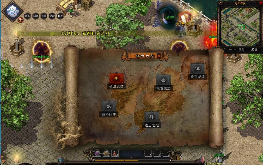 1大陆初级要塞、2大陆中级要塞、3大陆高级要塞;每日充值地图1、2、3里面有很多世界BOSS;每个野外地图的底层也有世界BOSS,会爆技能书、斩天令、独珍,还有世界BOSS的图鉴,图鉴点满提升巨大,武器衣服也能点图鉴,前期尽量先把图鉴点了再开自动回收。