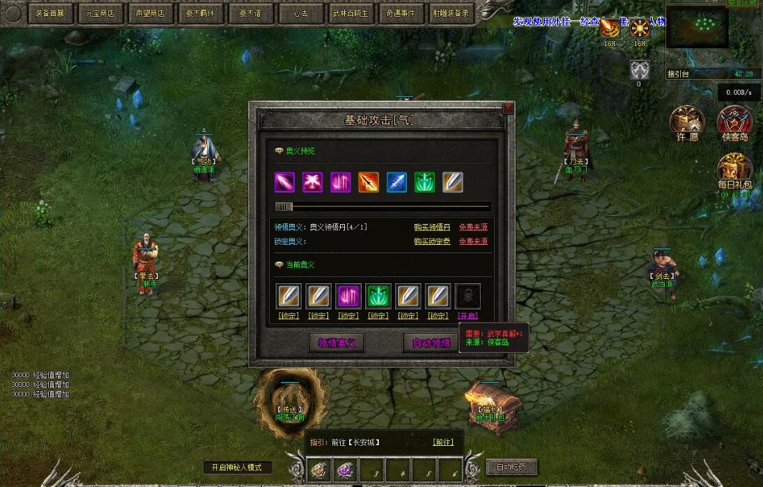 技能:可以购买书页或者打怪或者抽奖获得技能,相同的技能在武学导师那里合成二级的技能,最好是四级。