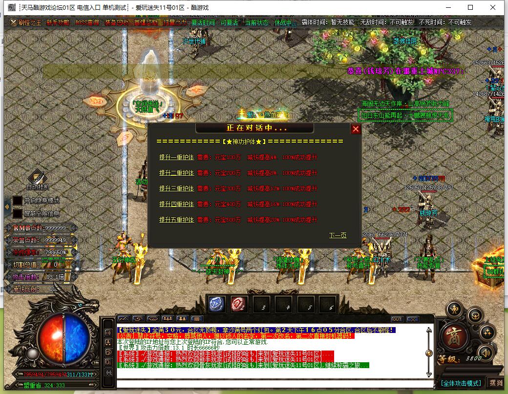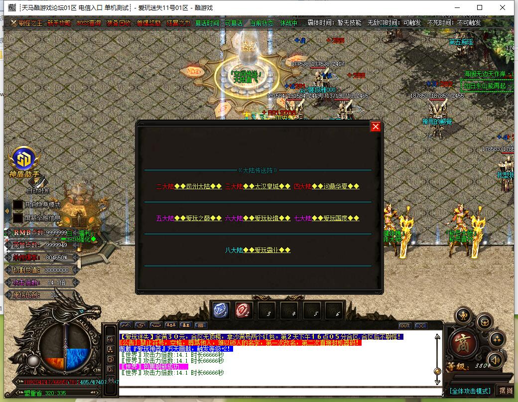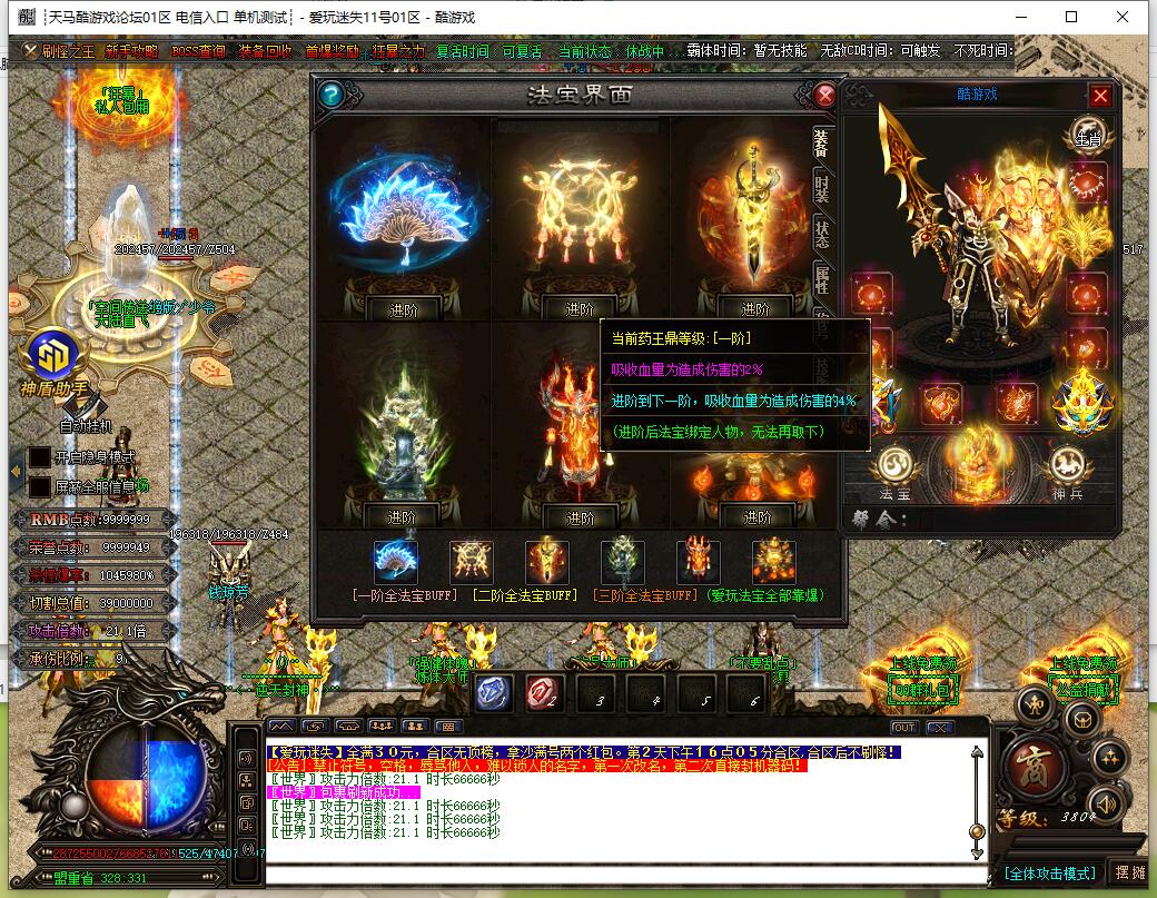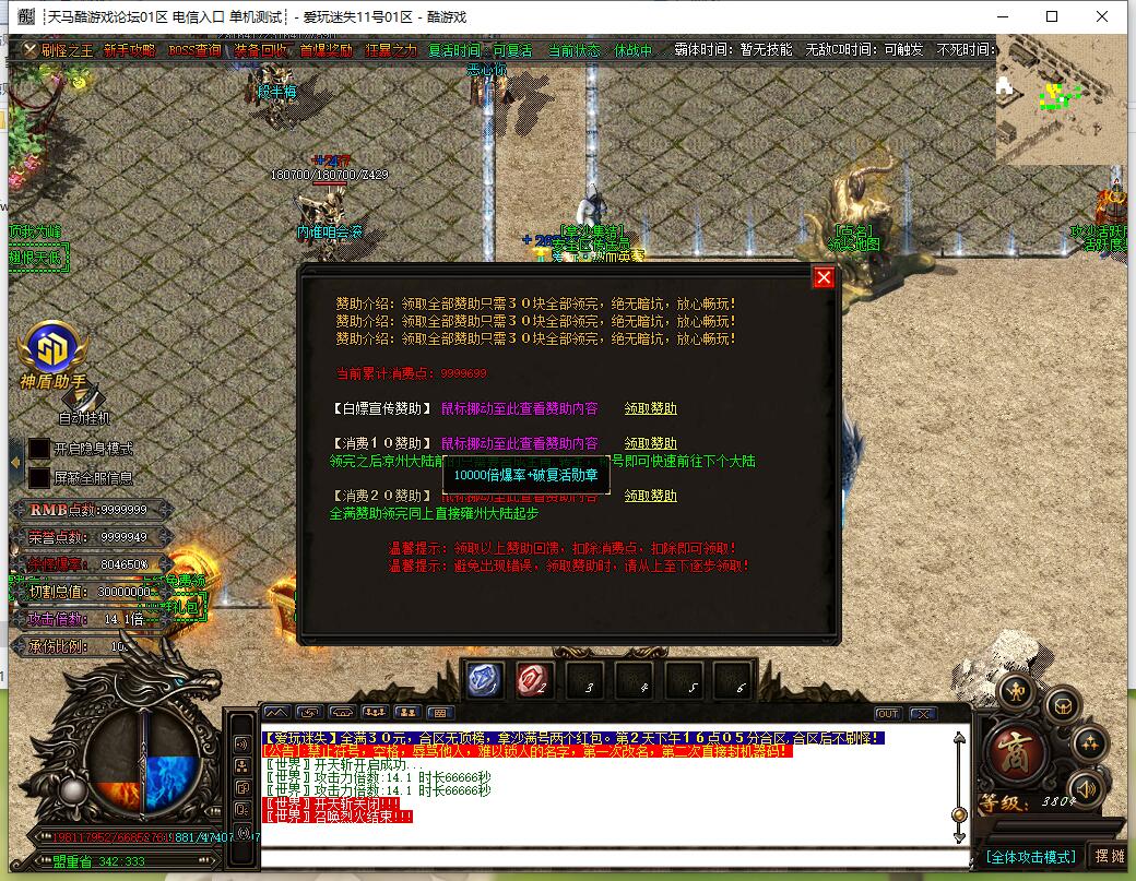 全民火龙单职业微变版本,纯散人服不花钱也可终极,一切靠打无合成,散人打金地图多怪物刷新速度快,装备货币保值,每日人品大爆发轻松300+收入。每天稳定四区开放(10:30 14:30 18:30 22:30),每个地图终极福利BOSS每晚22:01刷新,首区攻沙奖励RMB 588无封顶。市场最强封挂系统24小时接受举报,提醒设置二级密码防扫号。适度游戏益脑,拒绝盗版,享受健康生活。