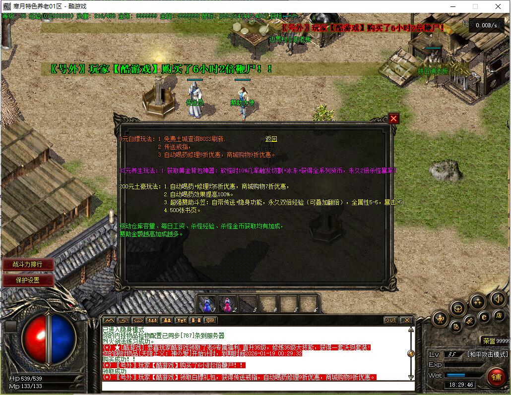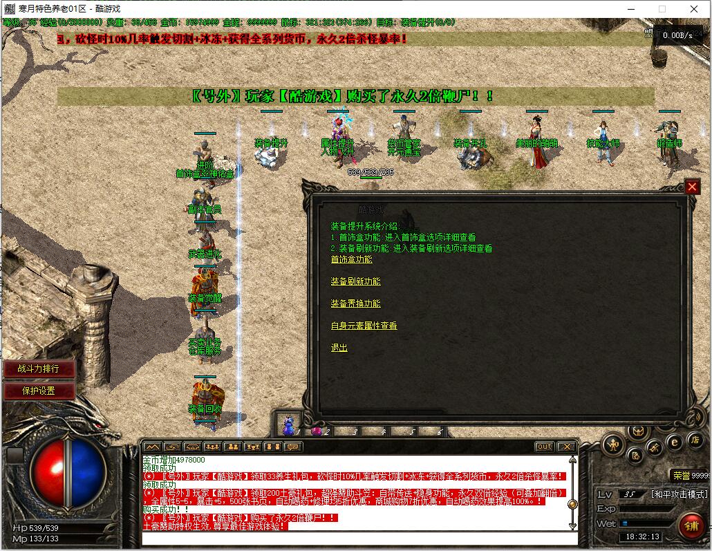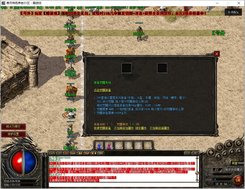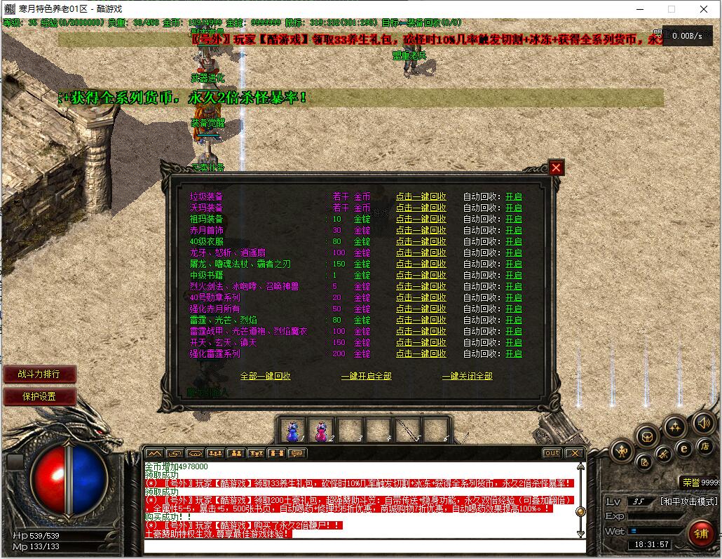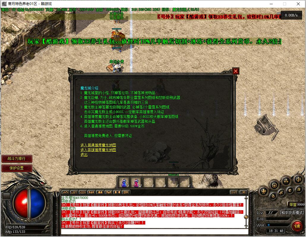 精修内容:1.所有新人上线,自动升到35级,获得【沃玛套装】1套,自动学习35级技能,赠送600万金币!帮大家度过前期发育期,轻松进入中期!2.增加33元养生礼包,获取黄金背包神器:砍怪时10%几率触发切割+冰冻+获得全系列货币,永久2倍杀怪暴率!3.增加200元土豪礼包,超强赞助斗笠:自带传送+隐身功能,永久双倍经验(可叠加翻倍),全属性5-5,暴击+5,赠送500张书页。4.增加2个鞭尸背包神器:一个是5块钱5小时的限时鞭尸,一个是66元永久使用的,把消费区分的更加明显!就这一个永久鞭尸就卖了好几个!5.提升10倍金锭充值比例,降低10倍商铺双倍卷轴价格,方便大家更快升级!6.把基础爆率和经验值进行适当提升,现在整个毕业下来2星期左右,整体游戏进度非常轻松愉快!7.里面设置了两个货币充值渠道,消费更加合理,内含充值比例!还有很多细节记不清了,请大家游戏中体验!精修内容:1.所有新人上线,自动升到35级,获得【沃玛套装】1套,自动学习35级技能,赠送600万金币!帮大家度过前期发育期,轻松进入中期!2.增加33元养生礼包,获取黄金背包神器:砍怪时10%几率触发切割+冰冻+获得全系列货币,永久2倍杀怪暴率!3.增加200元土豪礼包,超强赞助斗笠:自带传送+隐身功能,永久双倍经验(可叠加翻倍),全属性5-5,暴击+5,赠送500张书页。4.增加2个鞭尸背包神器:一个是5块钱5小时的限时鞭尸,一个是66元永久使用的,把消费区分的更加明显!就这一个永久鞭尸就卖了好几个!5.提升10倍金锭充值比例,降低10倍商铺双倍卷轴价格,方便大家更快升级!6.把基础爆率和经验值进行适当提升,现在整个毕业下来2星期左右,整体游戏进度非常轻松愉快!7.里面设置了两个货币充值渠道,消费更加合理,内含充值比例!还有很多细节记不清了,请大家游戏中体验!