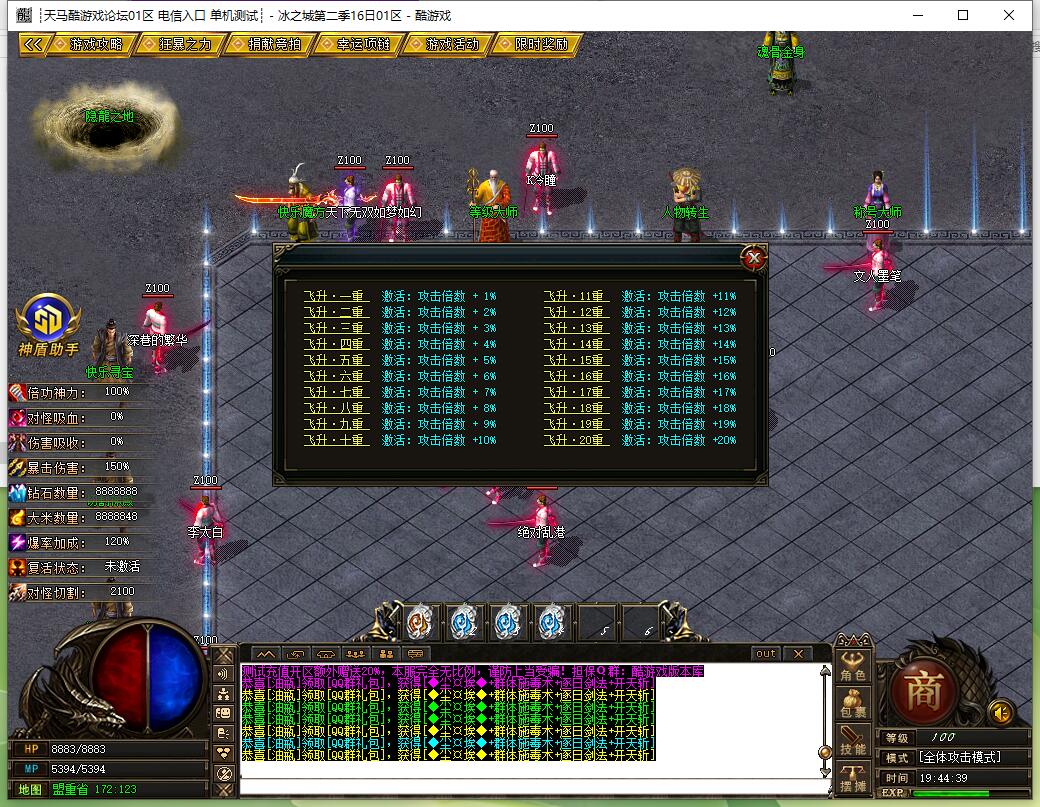 1.赞助激活:伤害吸收+10%对怪吸血+10% 攻击倍数+10% 爆率加100% 自动捡物2.沙城捐献:对怪切割+5000 攻击速度+50% 血量提升1888 攻魔道+50 自动回收3.狂暴之力:对怪切割+5000攻击速度+50%最大生命+10% 10%机率触发怪物鞭尸4.称号属性:对怪切割+1000-3万爆率+10% 300%吸血+1%- 10%满称号攻速+100%5.捐献排名:切割+20%-50%最大攻击+58-15% 最大血量+5%-15% 爆率 +50%-300%6.快乐魔王:攻击伤害2%-20%忽视防御2%-20% 攻魔道5%-50%第一刀打怪2%-20%7.切割属性:暴击机率18-30%对怪切割+ 000-66666 11级开始激活传送 CD: 15秒1.赞助激活:伤害吸收+10%对怪吸血+10% 攻击倍数+10% 爆率加100% 自动捡物2.沙城捐献:对怪切割+5000 攻击速度+50% 血量提升1888 攻魔道+50 自动回收3.狂暴之力:对怪切割+5000攻击速度+50%最大生命+10% 10%机率触发怪物鞭尸4.称号属性:对怪切割+1000-3万爆率+10% 300%吸血+1%- 10%满称号攻速+100%5.捐献排名:切割+20%-50%最大攻击+58-15% 最大血量+5%-15% 爆率 +50%-300%6.快乐魔王:攻击伤害2%-20%忽视防御2%-20% 攻魔道5%-50%第一刀打怪2%-20%7.切割属性:暴击机率18-30%对怪切割+ 000-66666 11级开始激活传送 CD: 15秒