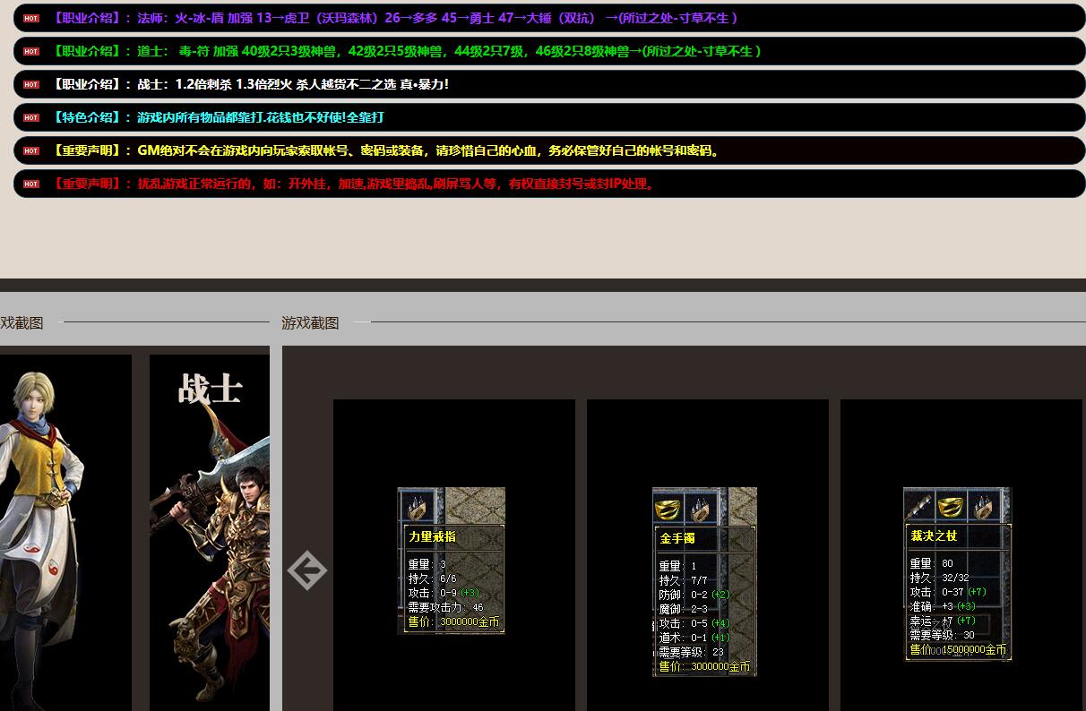 HOT[本服介绍: 本服在原76地图基础上增加了(八大神秘地图,进入方式玩家自行发掘。HOT[本服特色] : 本服为1.76金币复古,充值比例1:10W,适合所有复古玩家。灰玩家和充值大佬都可以玩的爽,散人玩家有充分发空间。HOT[装备介绍] : 商店沃马-祖玛-赤月-屠龙--极品+6HOT[版本介绍] : 客服微信号 36560477客服微信二号 36560477攻沙奖励后面加半月统战和月统战奖励定制高级铁观音和五子酒路斤HOT[爆率介绍] :爆率全开,所有物品游戏中获得,不卖装备,请免开尊口。本服没有任何福利待遇,游戏公平-一切靠打,纯散人服!HOT[爆率介绍] : 本服所有怪物均可爆出实物鸡和鹿需要挖),爆率超高,兑换充值与RMB充值完全洋!所有小极品可在土城NPC回收金币,经验,以及充值。HOT[版本介绍] : 本服:金币好打-增加一件回收垃圾功能-散人一样能成土豪--30分钟打千万不是梦、HOT[版本介绍] : 特色①:增加一键包内垃圾回收,7 6玩家利器!不充钱也可以致富!HOT[版本介绍] : 特色②:本服装备小极品较多, 人品爆发+5+6,装备价值超高,散人一夜暴富不再是梦。HOT[版本介绍] : 特色③:1-29级为30倍经验30-34为15倍经验35-39为8倍经验40-44为5倍经验45以后为3倍经验。HOT[职业介绍] :法师:火冰-盾加强13一→虎卫(沃玛森林) 26→多多45一勇士47一大锤(双抗)→(所过之处寸草不生)HOT[职业介绍] : 道士:毒-符加强40级2只3级神兽,42级2只5级神兽, 44级2只7级,46级2只8级神兽+(所过之 处寸草不生)HOT[职业介绍] : 战士: 1.2倍刺杀1.3倍烈火杀人越货不二之选真.暴力!HOT[特色介绍] : 游戏内所有物品都靠打花钱也不好使全靠打HOT重要声明] : GM绝对不会在游戏内向玩家索取帐号、密码或装备,请珍惜自己的心血,务必保管好自己的帐号和密码。HOT[重要声明] :游戏正常运行的,如:开外挂,加速游戏里捣乱,刷屏骂人等,有权直接封号或封IP处理。HOT[本服介绍: 本服在原76地图基础上增加了(八大神秘地图,进入方式玩家自行发掘。HOT[本服特色] : 本服为1.76金币复古,充值比例1:10W,适合所有复古玩家。灰玩家和充值大佬都可以玩的爽,散人玩家有充分发空间。HOT[装备介绍] : 商店沃马-祖玛-赤月-屠龙--极品+6HOT[版本介绍] : 客服微信号 36560477客服微信二号 36560477攻沙奖励后面加半月统战和月统战奖励定制高级铁观音和五子酒路斤HOT[爆率介绍] :爆率全开,所有物品游戏中获得,不卖装备,请免开尊口。本服没有任何福利待遇,游戏公平-一切靠打,纯散人服!HOT[爆率介绍] : 本服所有怪物均可爆出实物鸡和鹿需要挖),爆率超高,兑换充值与RMB充值完全洋!所有小极品可在土城NPC回收金币,经验,以及充值。HOT[版本介绍] : 本服:金币好打-增加一件回收垃圾功能-散人一样能成土豪--30分钟打千万不是梦、HOT[版本介绍] : 特色①:增加一键包内垃圾回收,7 6玩家利器!不充钱也可以致富!HOT[版本介绍] : 特色②:本服装备小极品较多, 人品爆发+5+6,装备价值超高,散人一夜暴富不再是梦。HOT[版本介绍] : 特色③:1-29级为30倍经验30-34为15倍经验35-39为8倍经验40-44为5倍经验45以后为3倍经验。HOT[职业介绍] :法师:火冰-盾加强13一→虎卫(沃玛森林) 26→多多45一勇士47一大锤(双抗)→(所过之处寸草不生)HOT[职业介绍] : 道士:毒-符加强40级2只3级神兽,42级2只5级神兽, 44级2只7级,46级2只8级神兽+(所过之 处寸草不生)HOT[职业介绍] : 战士: 1.2倍刺杀1.3倍烈火杀人越货不二之选真.暴力!HOT[特色介绍] : 游戏内所有物品都靠打花钱也不好使全靠打HOT重要声明] : GM绝对不会在游戏内向玩家索取帐号、密码或装备,请珍惜自己的心血,务必保管好自己的帐号和密码。HOT[重要声明] :游戏正常运行的,如:开外挂,加速游戏里捣乱,刷屏骂人等,有权直接封号或封IP处理。
