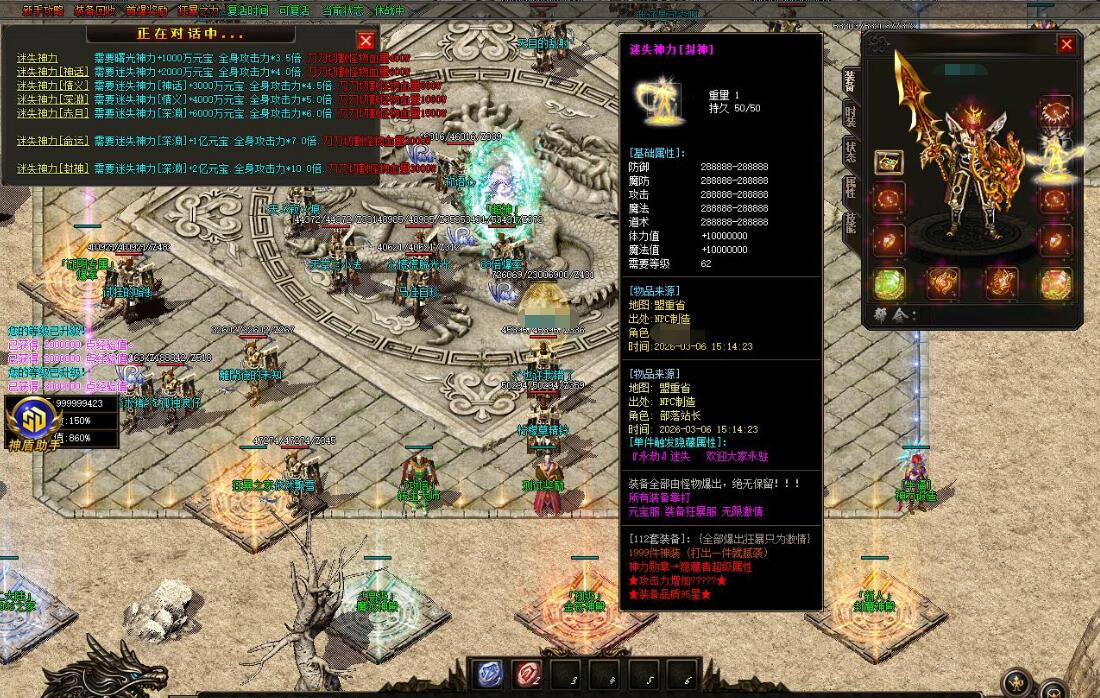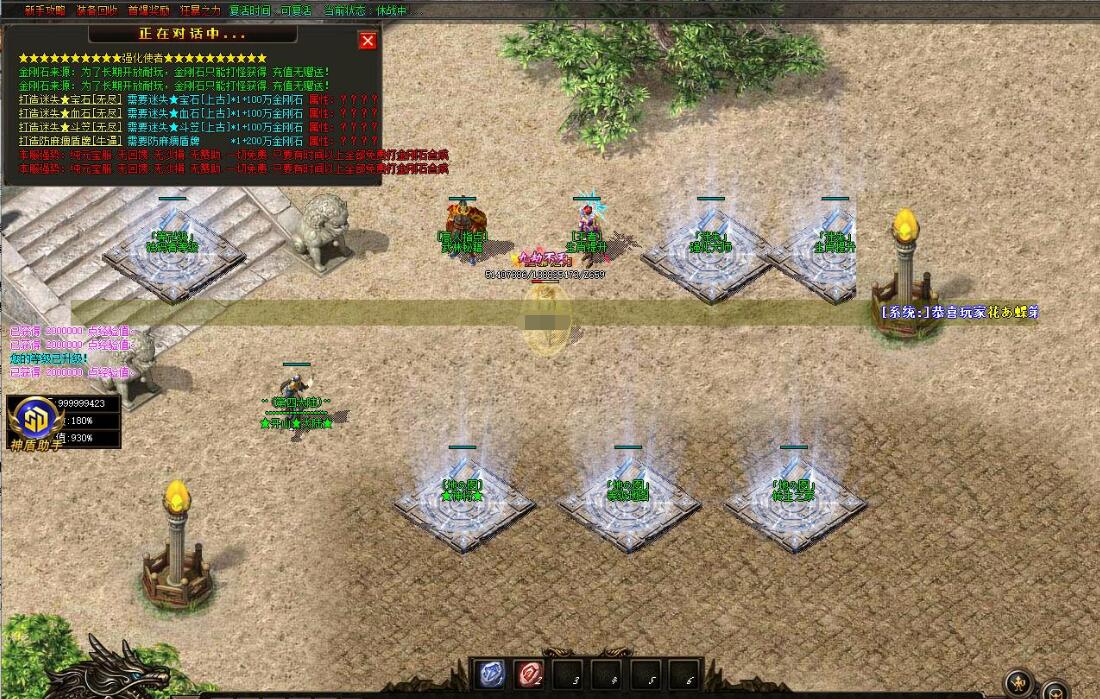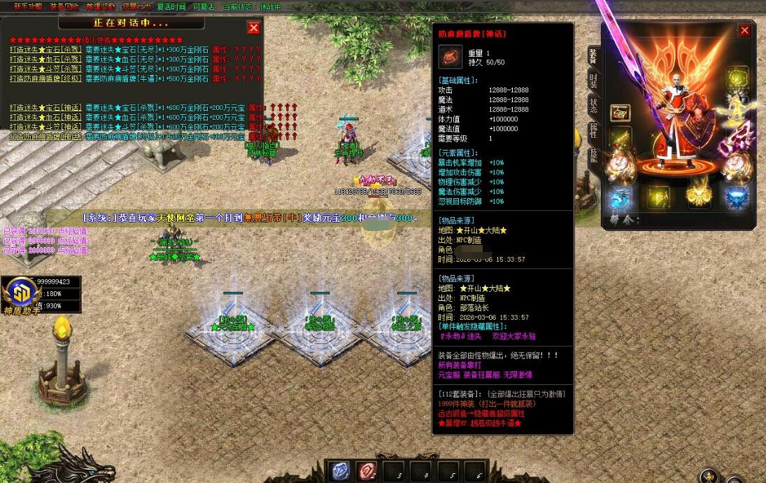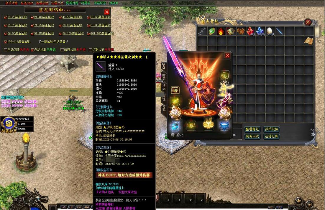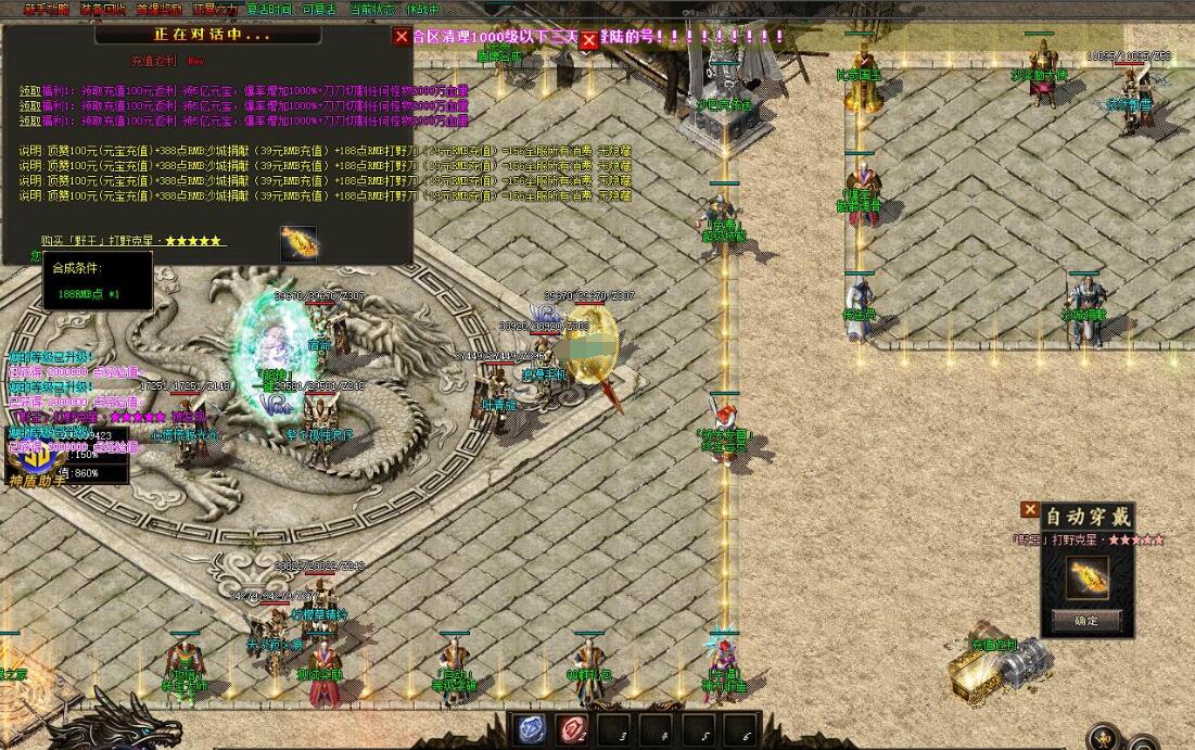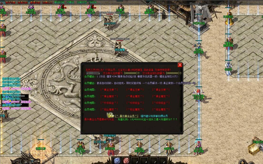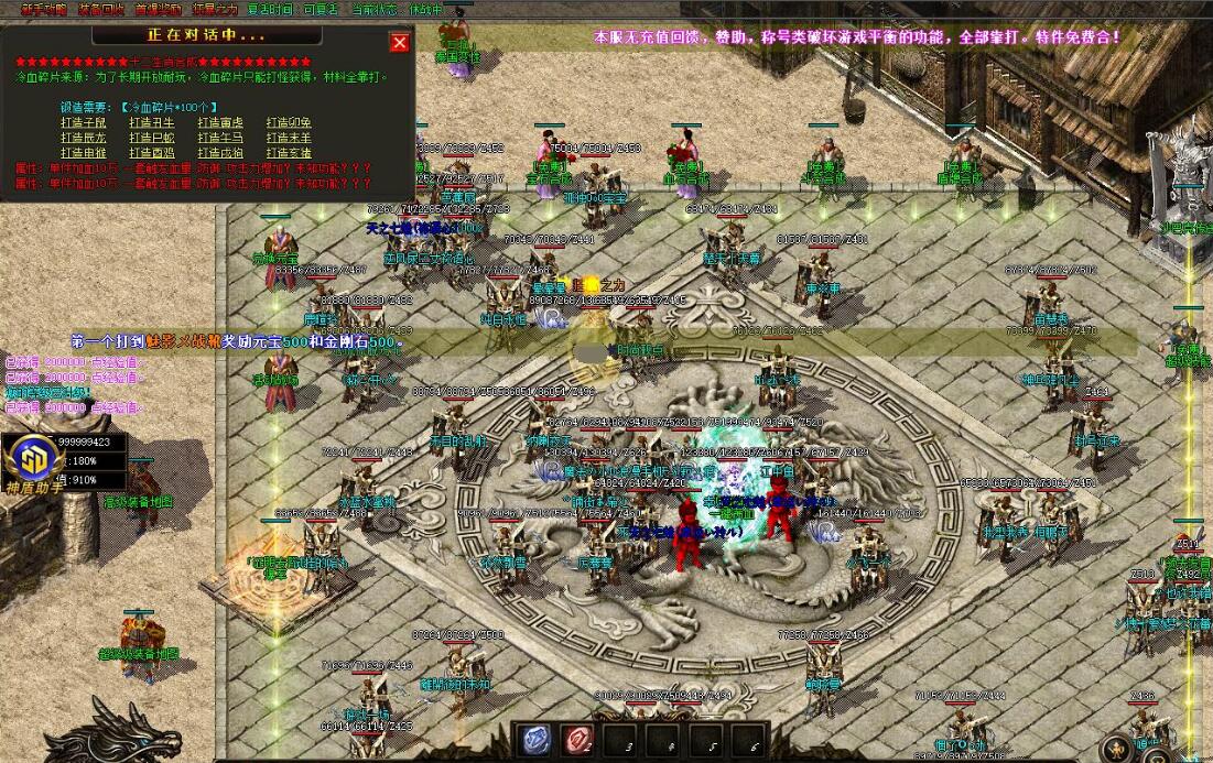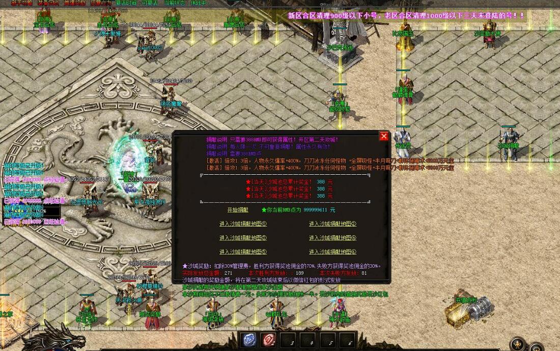游戏介绍:<【散人玩家路线】1、前期先加QQ群领取QQ群礼包(里面有刀刀切割+召唤金刚葫芦娃)。.2、前期先打小怪、小BOOS,获得装备、金刚石、元宝、材料碎片,先把血量搞上来,再去挑战大BOOS。.<【RMB玩家路线 】1、前期先加QQ群领取QQ群礼包(里面有刀刀切割+召唤金刚葫芦娃)。.2、RMB玩家可以无视上面先打小怪再搞血量,冲RMB点开通沙捐+狂暴,爆率疯狂增加。充值元宝也可以获得爆率.3、升级终生会员,一直可以升级到最终大陆.升级会员赠送金刚石,回土城转身,轻松下终极4、.优先升级勋章,附带刀刀切割,高级还能增加爆率5、土城上方NPC一键打造盾牌-斗笠-血石-宝石-盾牌。材料及元宝去后面几大陆用依次升级时装-生肖-勋章。.6、终级大陆进行飞升,所需材料冲值返利有赠送.最后一大陆进行修仙,需材料冲值返利有赠送。本服所有装备都可掉落,无需特意合成,具体玩法游戏内体验。.本服开区后第二天下午16点30合区,胜利一方获得沙捐所捐金额70%,失败方获得30%。游戏介绍:<【散人玩家路线】1、前期先加QQ群领取QQ群礼包(里面有刀刀切割+召唤金刚葫芦娃)。.2、前期先打小怪、小BOOS,获得装备、金刚石、元宝、材料碎片,先把血量搞上来,再去挑战大BOOS。.<【RMB玩家路线 】1、前期先加QQ群领取QQ群礼包(里面有刀刀切割+召唤金刚葫芦娃)。.2、RMB玩家可以无视上面先打小怪再搞血量,冲RMB点开通沙捐+狂暴,爆率疯狂增加。充值元宝也可以获得爆率.3、升级终生会员,一直可以升级到最终大陆.升级会员赠送金刚石,回土城转身,轻松下终极4、.优先升级勋章,附带刀刀切割,高级还能增加爆率5、土城上方NPC一键打造盾牌-斗笠-血石-宝石-盾牌。材料及元宝去后面几大陆用依次升级时装-生肖-勋章。.6、终级大陆进行飞升,所需材料冲值返利有赠送.最后一大陆进行修仙,需材料冲值返利有赠送。本服所有装备都可掉落,无需特意合成,具体玩法游戏内体验。.本服开区后第二天下午16点30合区,胜利一方获得沙捐所捐金额70%,失败方获得30%。