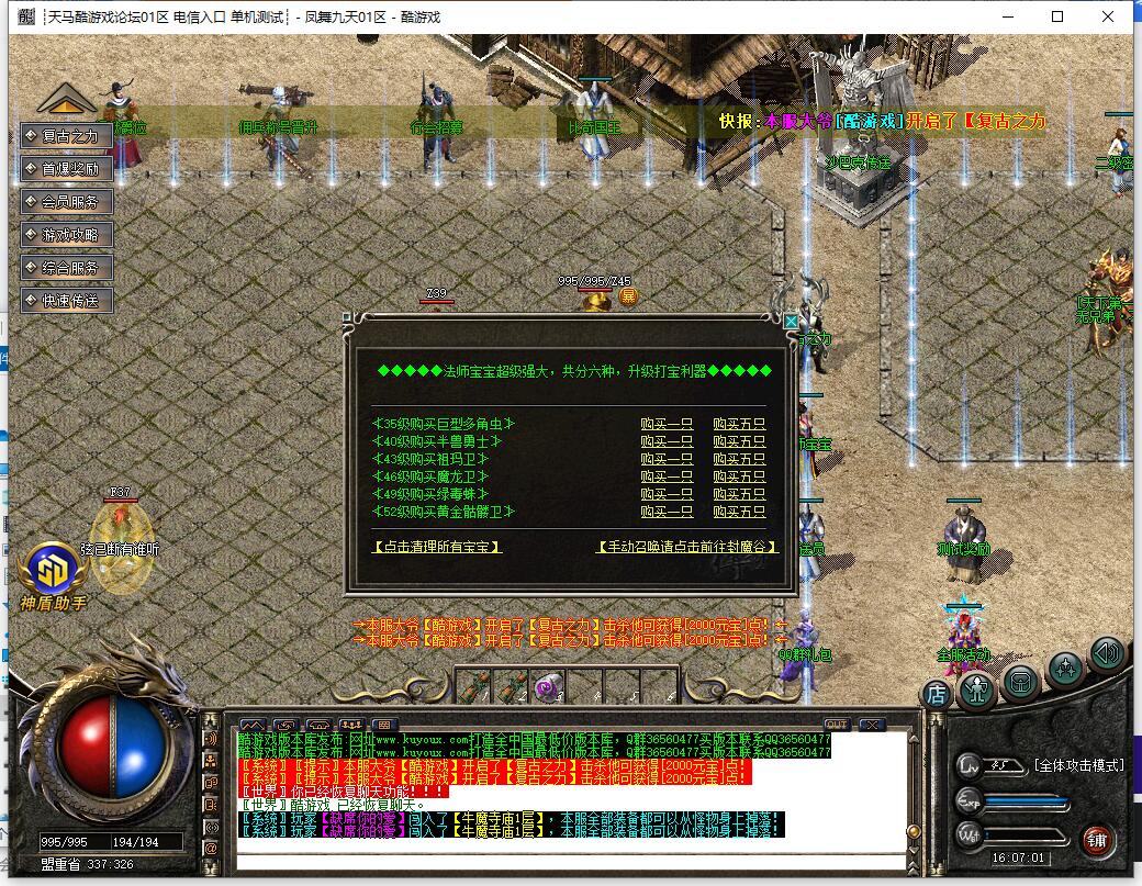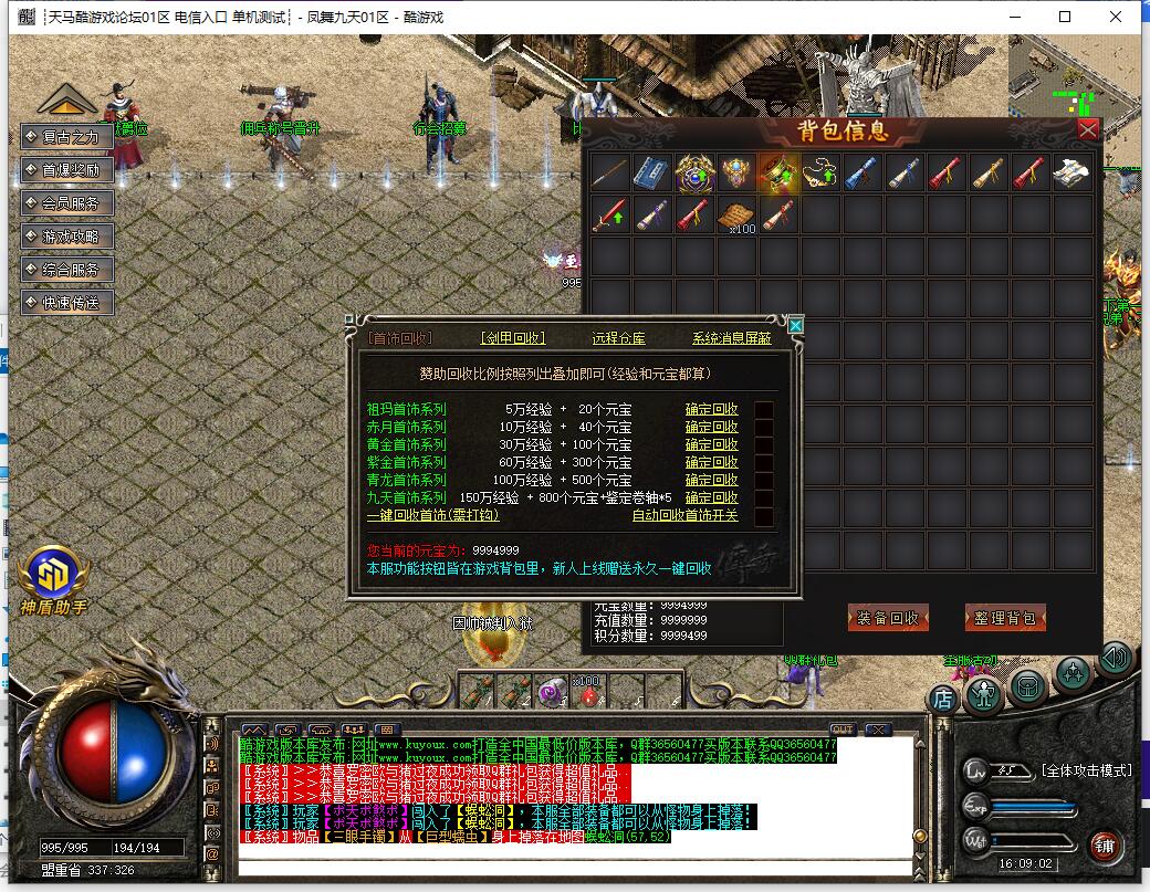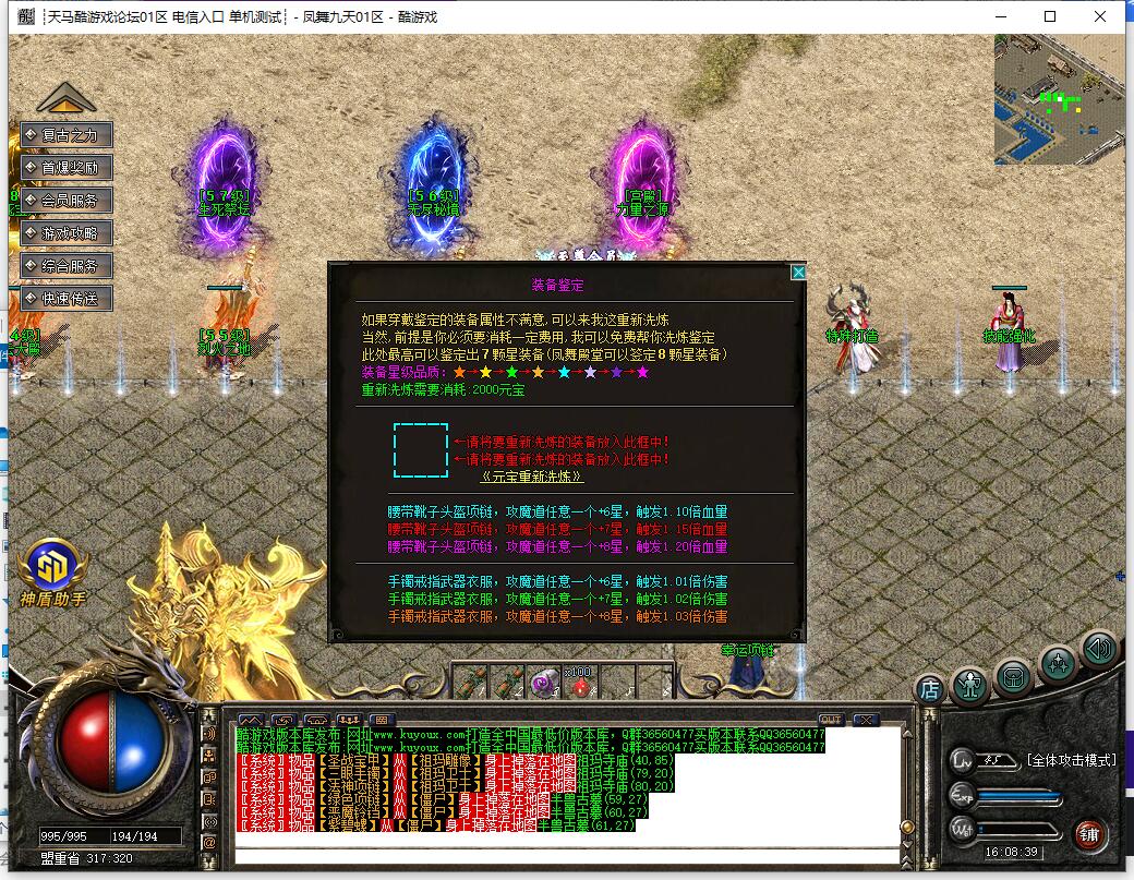 本服还原干净聊天框,无垃圾信息及回收提示,商铺不售材料全靠打怪,永久回收物品均由怪物爆出。游戏问题可QQ群联系客服完美解答,无论是否消费均用心服务,所有玩家公平对待。交易安全需通过商铺RMB点交易,提现手续费仅10%;私下交易一经查实封号并清除提现记录;禁止自动刷屏、骂人小号占安全区,违者警告或封号;严禁加速脱机外挂,发现必删永不解封。