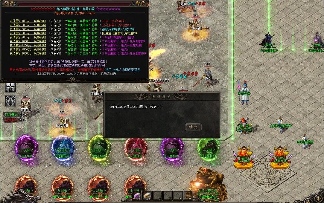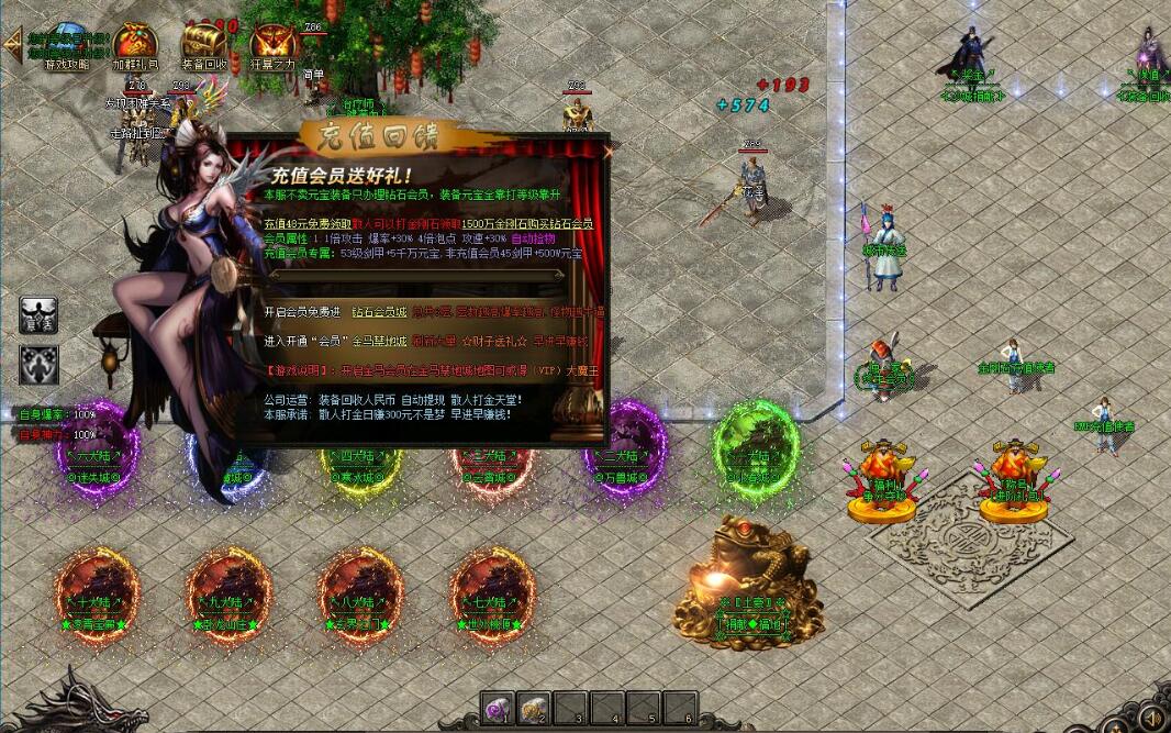 游戏介绍:①·【游戏说明】:拒绝快餐,重温经典1.特殊装备靠元宝合成,材料和元宝只爆不卖全部靠打,爆出宝箱可以开出经验.装备.RMB卷,等物品(备注:红莲、战鼓、勋章、图腾、血石为特殊装备,绝世终极特殊只能靠打怪爆出,无法合成)2.游戏泡点封顶120级。120级后靠BOSS掉落的宝箱开启经验升级,开启宝箱只耗元宝(元宝只能靠打)3.每样装备都自带攻倍属性,人民币玩家充值了不打装备的,PK打不过的请找自身原因,谢谢!4.公平公正:游戏任何人爆率同等,不做任何特殊设置,充值多与少只是发展速度快慢,打怪效率的差距.散人玩法:上线就送5级图腾,5级血石,领取QQ礼包:送5级战鼓、5级红莲、勋章max,利用召唤灵宠功能,各大地图打小BOSS,刷元宝快速把“图腾”等级升起来。越高级的图腾可召唤越厉害的宝宝,然后积攒金刚石,购买会员与“召唤圣兽”,开启狂暴.一样可以发展起来(散人通过保值回收及剑甲首爆奖励也可轻松打出满称号)小资充值玩家:切记前期先把自己等人物等级弄高增加宝宝等威力,等级可开箱子提升经验!!②·【消费介绍】:一.小资玩家:充值88元金刚石,免费领取钻石会员和金马会员.尽量多转生,开启狂暴,购买召唤圣兽技能,打元宝合成特殊装备,依靠圣兽宝宝直接撸怪干装备。二.牛逼人生:充值500元,按上述操作,再领取充值称号完成转生领取限时奖励,免费合成中级程度的特殊装备(斗笠、勋章、面巾、战鼓、红莲、血石)。三.土豪晋阶:按上述操作,领取充值称号,进行高等阶转生触发高倍攻.提高打怪伤害.遇怪就干直接起飞.<重点说明>转身最高为20转,是提高打怪效率最快都方式,并且提升自身都攻击倍数。前期建议玩家不要越级打怪,尽量去打一些自己可以打得动的,或者效率较高的怪物!<挂机说明>此功能设定只为玩家能够解放双手,缓解疲劳,~键自动战斗挂机,早进早赚钱!<金马会员说明>可以增加2倍攻击速度、800w泡点、1.2倍攻、50%爆率,享受2倍回收,自动回收以及自动捡取等功能。<宝宝说明>本服宝宝分为2种,一种是散人用的图腾灵宠,图腾等级越高灵宠威力越强,散人玩家前期打怪必备物品!只可召唤一个!另外一种是“召唤圣兽”宝宝,需要金刚石购买,圣兽随着人物等级提升而增加威力,每提升等级10级变化一次,150为终极,需要小退重新召唤,“召唤圣兽”宝宝是前期游戏打怪必备神兽,最低级的圣兽威力都高于终极的图腾宝宝,可召唤2只!超级牛逼!怪物介绍 游戏任何地图每20分钟刷新N个“ ☆☆【福利】财神星君☆☆ ”“☆☆【福利】财子送礼☆☆”必爆1-5元充值点装备介绍 游戏共计67套装备,每样装备都是单件神力,非常牛逼。所有装备全部靠打怪爆出。打出一把神力武器屌丝都可逆袭干土豪.进阶说明 转生是提高打怪速度的最重要关键.生肖,特戒,时装,盾牌等特殊件都是加强人物属性的东西,人物攻击越高配合人物转身打怪速度也越快,后期还有渡劫,强化等新颖功能,请大家在游戏中自行体验!游戏介绍:①·【游戏说明】:拒绝快餐,重温经典1.特殊装备靠元宝合成,材料和元宝只爆不卖全部靠打,爆出宝箱可以开出经验.装备.RMB卷,等物品(备注:红莲、战鼓、勋章、图腾、血石为特殊装备,绝世终极特殊只能靠打怪爆出,无法合成)2.游戏泡点封顶120级。120级后靠BOSS掉落的宝箱开启经验升级,开启宝箱只耗元宝(元宝只能靠打)3.每样装备都自带攻倍属性,人民币玩家充值了不打装备的,PK打不过的请找自身原因,谢谢!4.公平公正:游戏任何人爆率同等,不做任何特殊设置,充值多与少只是发展速度快慢,打怪效率的差距.散人玩法:上线就送5级图腾,5级血石,领取QQ礼包:送5级战鼓、5级红莲、勋章max,利用召唤灵宠功能,各大地图打小BOSS,刷元宝快速把“图腾”等级升起来。越高级的图腾可召唤越厉害的宝宝,然后积攒金刚石,购买会员与“召唤圣兽”,开启狂暴.一样可以发展起来(散人通过保值回收及剑甲首爆奖励也可轻松打出满称号)小资充值玩家:切记前期先把自己等人物等级弄高增加宝宝等威力,等级可开箱子提升经验!!②·【消费介绍】:一.小资玩家:充值88元金刚石,免费领取钻石会员和金马会员.尽量多转生,开启狂暴,购买召唤圣兽技能,打元宝合成特殊装备,依靠圣兽宝宝直接撸怪干装备。二.牛逼人生:充值500元,按上述操作,再领取充值称号完成转生领取限时奖励,免费合成中级程度的特殊装备(斗笠、勋章、面巾、战鼓、红莲、血石)。三.土豪晋阶:按上述操作,领取充值称号,进行高等阶转生触发高倍攻.提高打怪伤害.遇怪就干直接起飞.<重点说明>转身最高为20转,是提高打怪效率最快都方式,并且提升自身都攻击倍数。前期建议玩家不要越级打怪,尽量去打一些自己可以打得动的,或者效率较高的怪物!<挂机说明>此功能设定只为玩家能够解放双手,缓解疲劳,~键自动战斗挂机,早进早赚钱!<金马会员说明>可以增加2倍攻击速度、800w泡点、1.2倍攻、50%爆率,享受2倍回收,自动回收以及自动捡取等功能。<宝宝说明>本服宝宝分为2种,一种是散人用的图腾灵宠,图腾等级越高灵宠威力越强,散人玩家前期打怪必备物品!只可召唤一个!另外一种是“召唤圣兽”宝宝,需要金刚石购买,圣兽随着人物等级提升而增加威力,每提升等级10级变化一次,150为终极,需要小退重新召唤,“召唤圣兽”宝宝是前期游戏打怪必备神兽,最低级的圣兽威力都高于终极的图腾宝宝,可召唤2