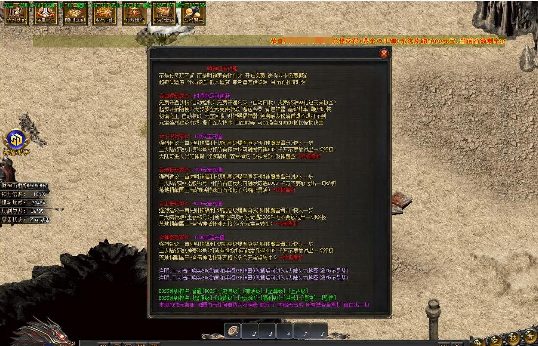 游戏介绍:财神归来攻略四个大陆新版财神不是传奇玩不起 而是财神更有性价比 开启免费 送你八步免费趣游超级体验感 什么都送散人追梦服务器万倍资源 当年的激情时刻☆白嫖玩家☆:时间充足可逆袭免费开通沙捐(自动捡物) 免费开通会员 (自动回收) 免费领取QQ礼包完美粉丝)起步开始随便八大步骤全部免费领取 赠送会员 背包神器高级爆率 鞭尸时装秘境之王 自动拾取元宝回收 财神赐福神器免费触发秘境首爆不爆打不到元宝强烈建议游戏,提升五大特殊 回血时等 可加强自身防御抵抗怪物伤害☆小资玩家☆:100元宝充值强烈建议一首先财神福利+切割高级爆率真实+财神魔盒晋升)快人一步二大陆领取(小资称号+)打所有怪物均可触发奇遇BDS 千万不要放过出一切终极大陆可进入炎阳神殿.修罗禁地.森林神坛.财神发财.财神魔盒>→终极靠打☆老板玩家☆:/300元宝充值强烈建议一首先财神福利+切割高级爆率真实+财神魔盒晋升)快人一步二大陆领取(老板称号+)打所有怪物均可触发奇遇B00S 千万不要放过出一切终极落地捐献国王+满神话特殊血石和假子(切割+复活)>→终极靠打☆土豪玩家☆:/500元宝充值强烈建议一首先财神福利+切割高级爆率真实+财神魔盒晋升)快人一步二大陆领取(土豪称号)打所有怪物均可发奇遇B00S千万不要放过出一切终极落地捐献国王+全满神话特殊五格(多余元宝点转生)>→终极靠打☆神豪玩家☆:1000元宝充值强烈建议一首先财神福利+切割高级爆率真实+财神魔盒晋升)快人一步二大陆领取(神豪称号)打所有怪物均可触发奇遇BOOS 千万不要放过出一切终极落地捐献国王+全满神话特殊五格《多余元宝点转生》>→终极靠打注明:三大陆可购买BUG勋章和手镯(PR神器)佩戴后可进入4大陆火力地图(终极不是梦)注明:三大陆可购买BUG勋章和手镯(PR神器)佩戴后可进入4大陆火力地图(终极不是梦)BOSS等级排名:普通[BOSS]-[史诗级]-[神话级]-[至尊级]-[上古级]BOSS等级排名:[起源级]-[鸿蒙级]-[无双级]-[福利级]-[洪荒]-[混沌]一[恐怖]本服为纯元宝服 地图内无任何暗坑以及消费 就完了本服无合成 所有装备全靠打 脸白出一切游戏介绍:财神归来攻略四个大陆新版财神不是传奇玩不起 而是财神更有性价比 开启免费 送你八步免费趣游超级体验感 什么都送散人追梦服务器万倍资源 当年的激情时刻☆白嫖玩家☆:时间充足可逆袭免费开通沙捐(自动捡物) 免费开通会员 (自动回收) 免费领取QQ礼包完美粉丝)起步开始随便八大步骤全部免费领取 赠送会员 背包神器高级爆率 鞭尸时装秘境之王 自动拾取元宝回收 财神赐福神器免费触发秘境首爆不爆打不到元宝强烈建议游戏,提升五大特殊 回血时等 可加强自身防御抵抗怪物伤害☆小资玩家☆:100元宝充值强烈建议一首先财神福利+切割高级爆率真实+财神魔盒晋升)快人一步二大陆领取(小资称号+)打所有怪物均可触发奇遇BDS 千万不要放过出一切终极大陆可进入炎阳神殿.修罗禁地.森林神坛.财神发财.财神魔盒>→终极靠打☆老板玩家☆:/300元宝充值强烈建议一首先财神福利+切割高级爆率真实+财神魔盒晋升)快人一步二大陆领取(老板称号+)打所有怪物均可触发奇遇B00S 千万不要放过出一切终极落地捐献国王+满神话特殊血石和假子(切割+复活)>→终极靠打☆土豪玩家☆:/500元宝充值强烈建议一首先财神福利+切割高级爆率真实+财神魔盒晋升)快人一步二大陆领取(土豪称号)打所有怪物均可发奇遇B00S千万不要放过出一切终极落地捐献国王+全满神话特殊五格(多余元宝点转生)>→终极靠打☆神豪玩家☆:1000元宝充值强烈建议一首先财神福利+切割高级爆率真实+财神魔盒晋升)快人一步二大陆领取(神豪称号)打所有怪物均可触发奇遇BOOS 千万不要放过出一切终极落地捐献国王+全满神话特殊五格《多余元宝点转生》>→终极靠打注明:三大陆可购买BUG勋章和手镯(PR神器)佩戴后可进入4大陆火力地图(终极不是梦)注明:三大陆可购买BUG勋章和手镯(PR神器)佩戴后可进入4大陆火力地图(终极不是梦)BOSS等级排名:普通[BOSS]-[史诗级]-[神话级]-[至尊级]-[上古级]BOSS等级排名:[起源级]-[鸿蒙级]-[无双级]-[福利级]-[洪荒]-[混沌]一[恐怖]本服为纯元宝服 地图内无任何暗坑以及消费 就完了本服无合成 所有装备全靠打 脸白出一切