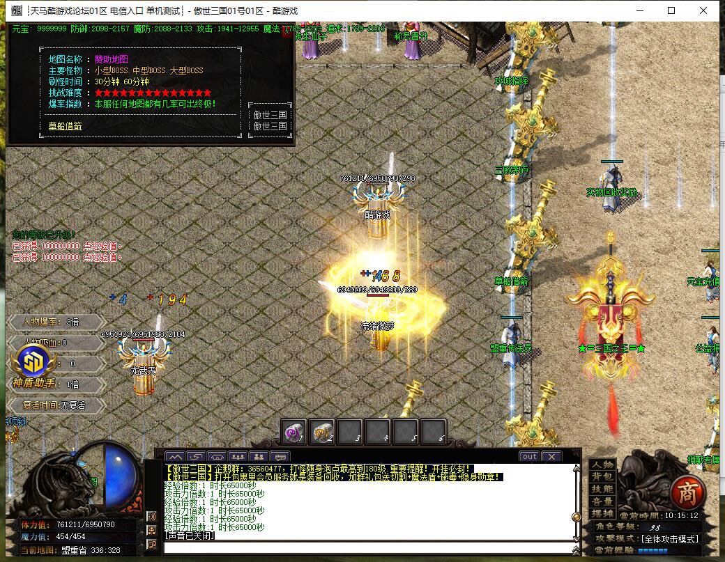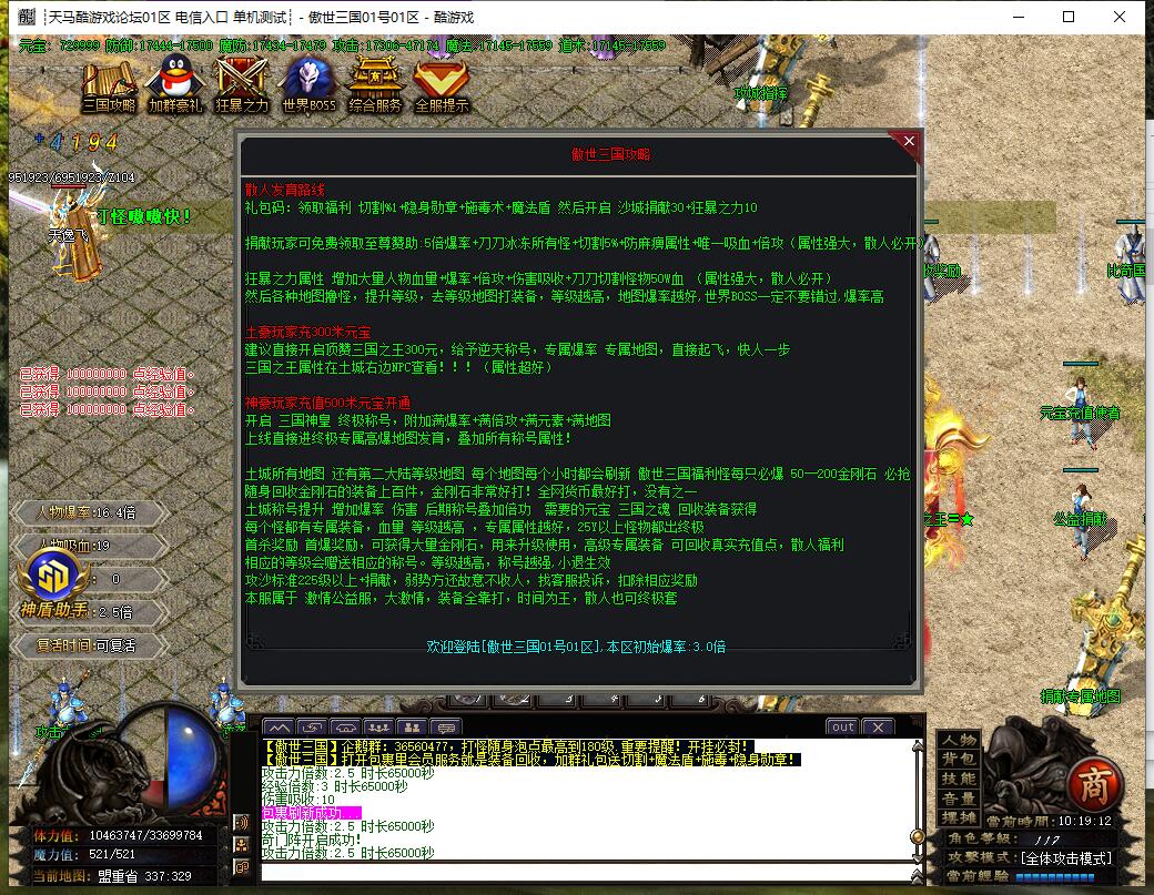 全民火龙单职业微变版本,纯散人服不花钱也可终极,一切靠打无合成,散人打金地图多怪物刷新速度快,装备货币保值,每日人品大爆发轻松300+收入。每天稳定四区开放(10:30 14:30 18:30 22:30),每个地图终极福利BOSS每晚22:01刷新,首区攻沙奖励RMB 588无封顶。市场最强封挂系统24小时接受举报,提醒设置二级密码防扫号。适度游戏益脑,拒绝盗版,享受健康生活。