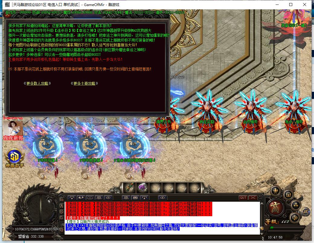 - B(*)本服检测封挂已经很严格,由于WG更新快.如有漏网之鱼,欢迎大家举报!一经证实!封号,封机器注册码!装备难打来之不易,请珍惜!机器注册码一旦被封,本游戏的任何区都无法登陆!