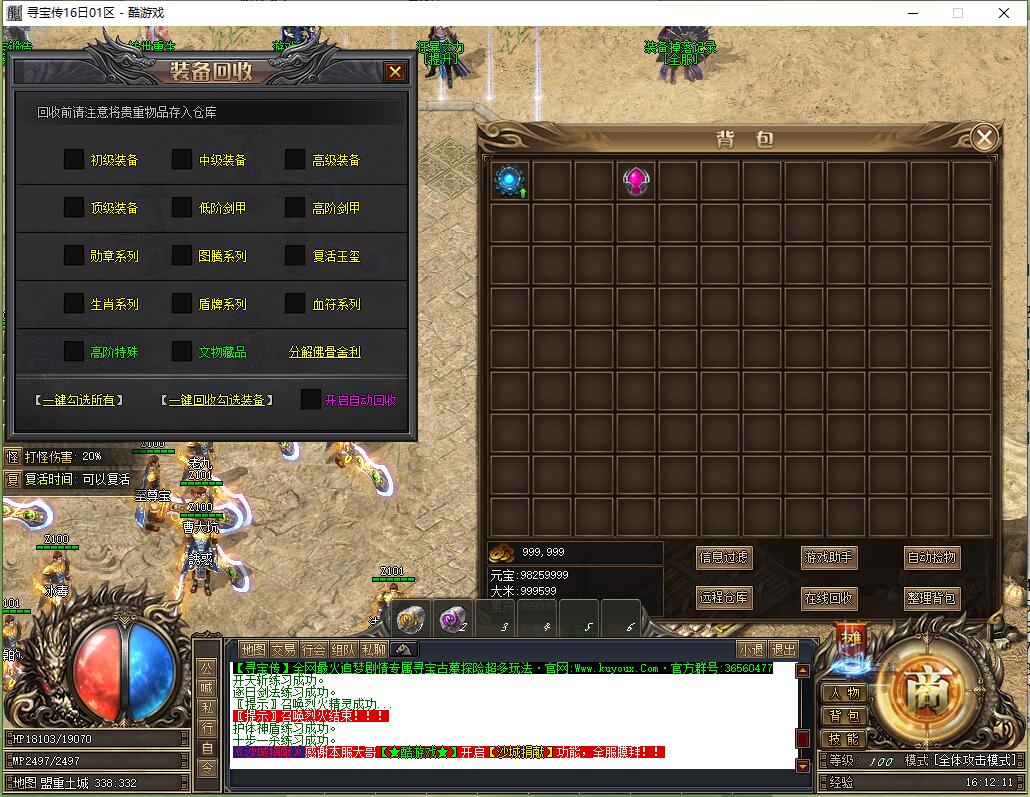 本服还原干净聊天框,无垃圾信息及回收提示,商铺不售材料全靠打怪,永久回收物品均由怪物爆出。游戏问题可QQ群联系客服完美解答,无论是否消费均用心服务,所有玩家公平对待。交易安全需通过商铺RMB点交易,提现手续费仅10%;私下交易一经查实封号并清除提现记录;禁止自动刷屏、骂人小号占安全区,违者警告或封号;严禁加速脱机外挂,发现必删永不解封。