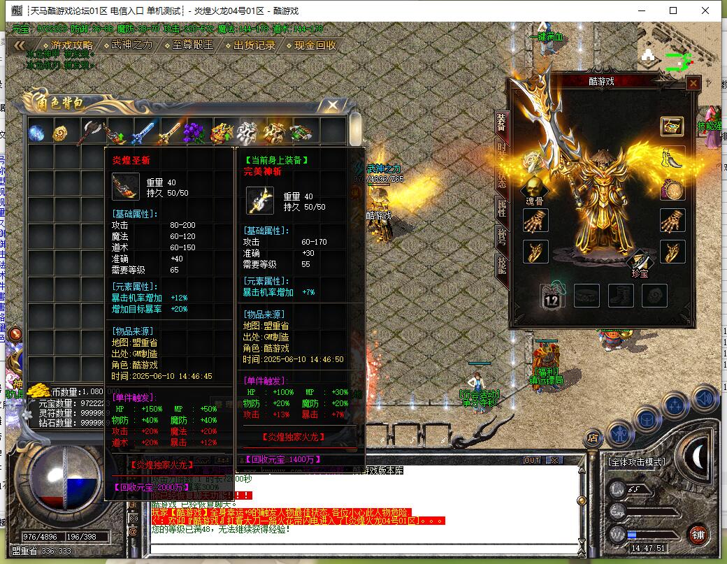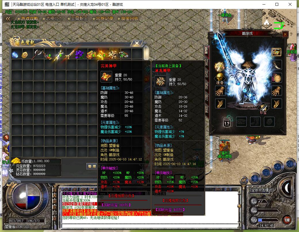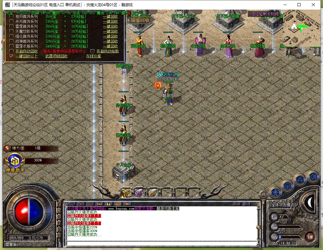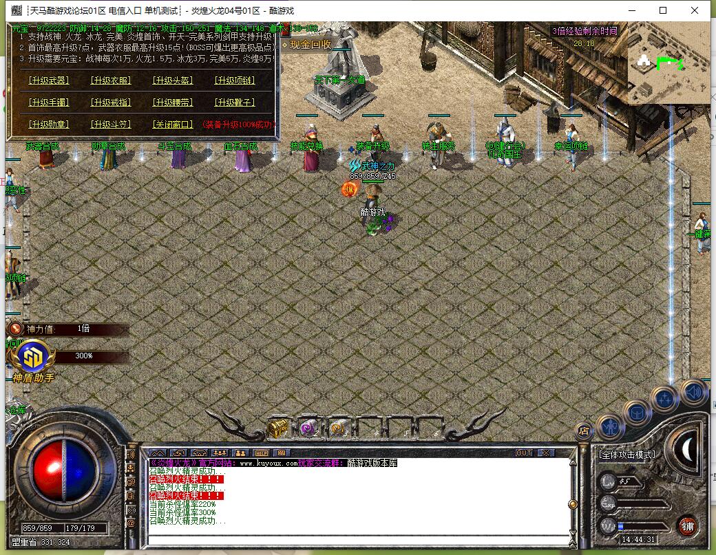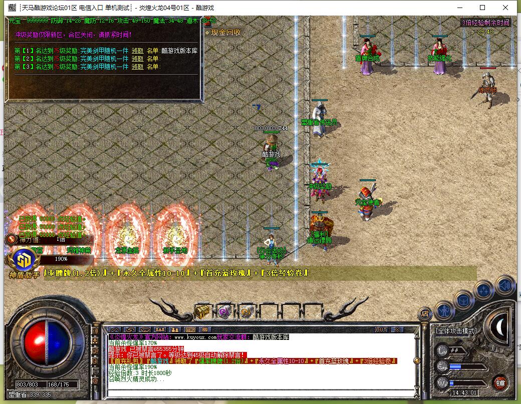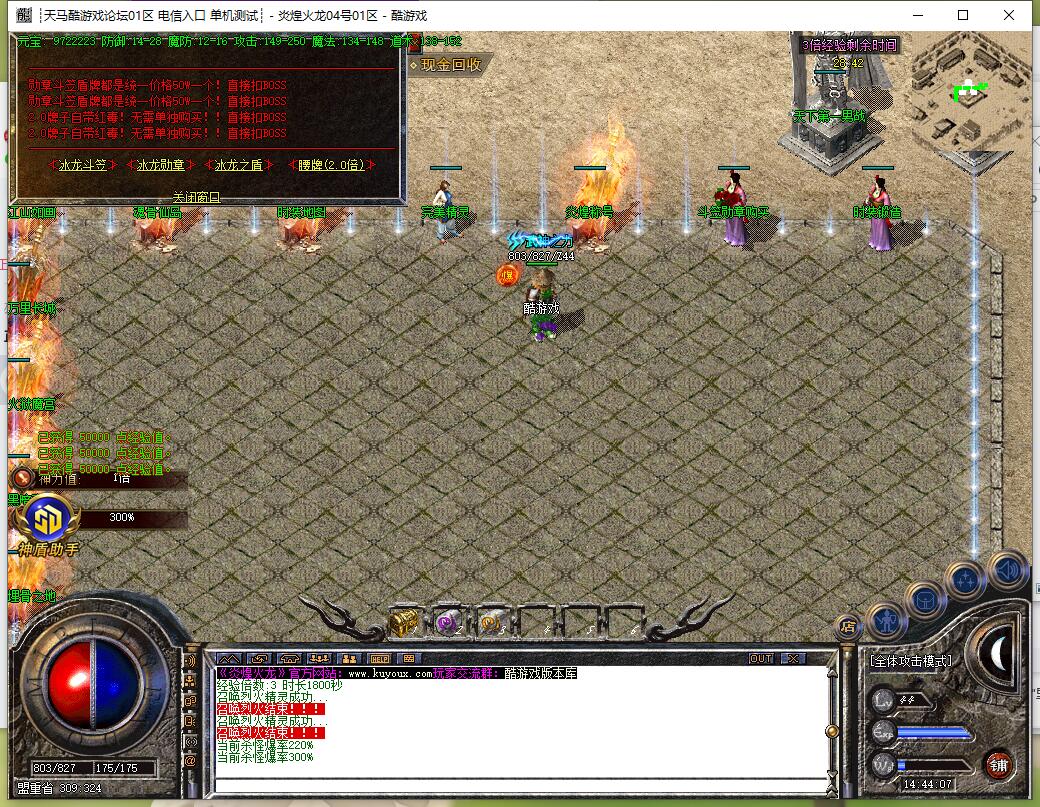 起号消费:请根据自身条件来选择纱绢30元狂暴8.8W 大狂暴18.8W 冰龙勋章50W 冰龙斗笠50W 冰龙盾牌50W 满魂骨700W(100%爆率)1介时装555W(有专属地图开区可直接扣BOSS)终极时装(1介时装+888W可回收)(有专属地图!爆率超高)(属性攻魔道80血量15%爆率150 开天斩烈火增强10%打架打怪必备)