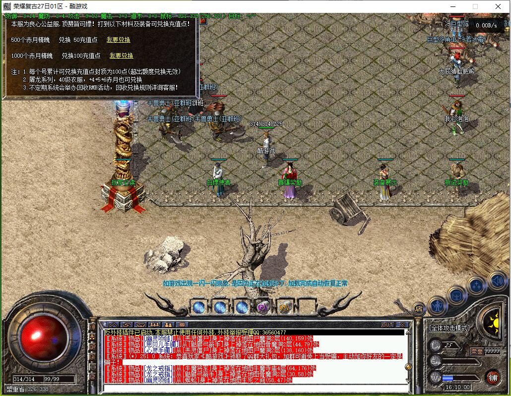 - 35000血怪(火龙教主、荣耀魔兽、万年树妖、地藏王、荣耀卫士、暗之祖玛教主)。