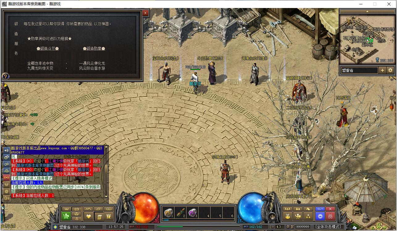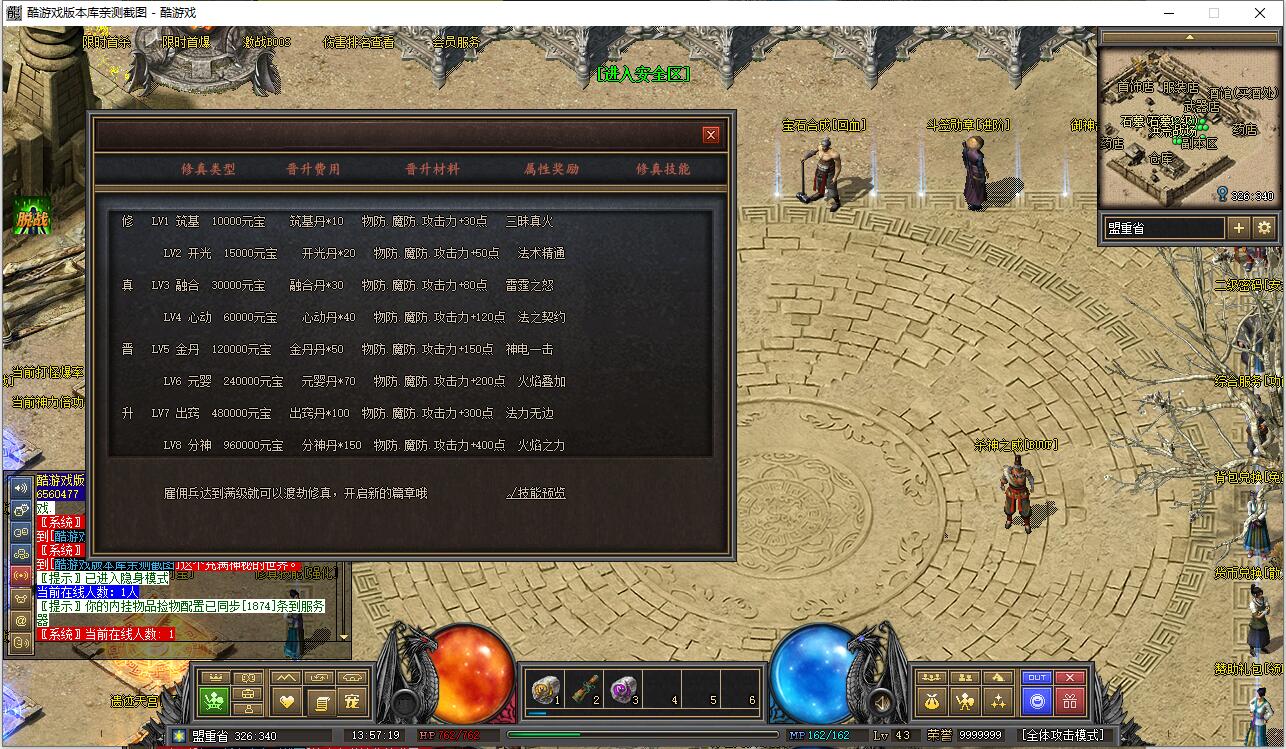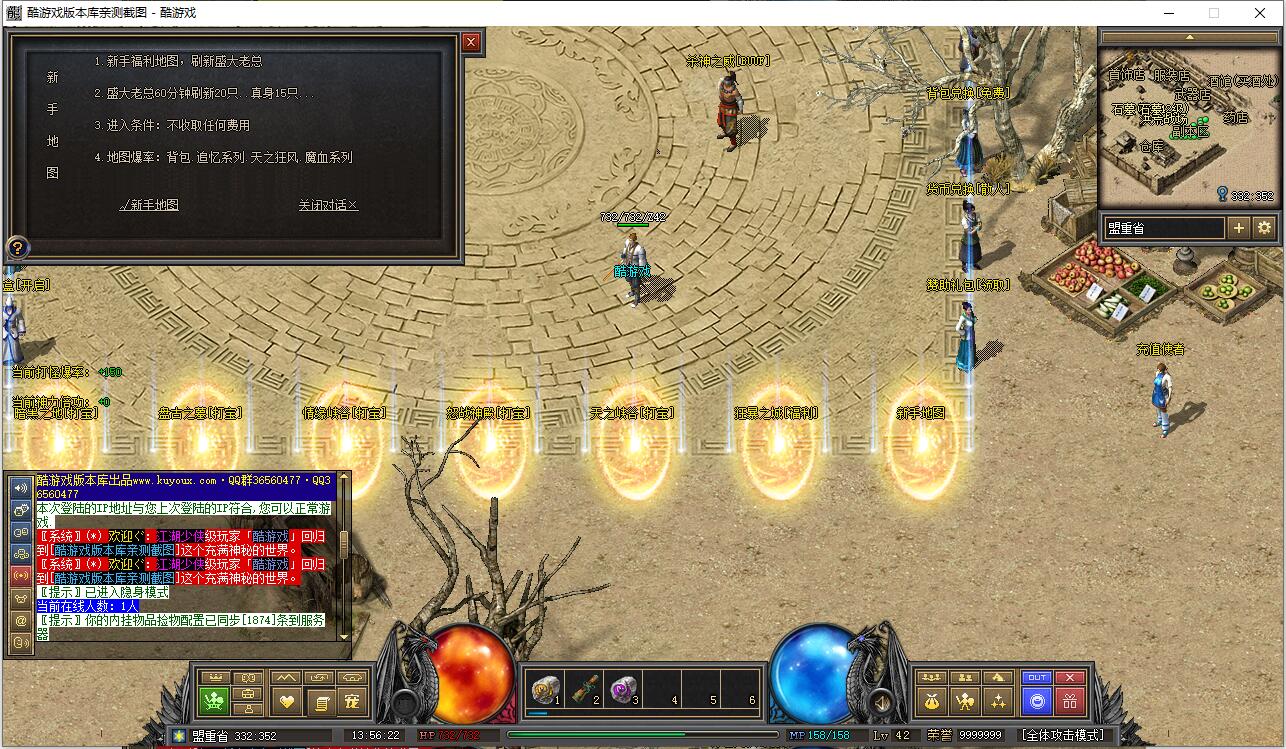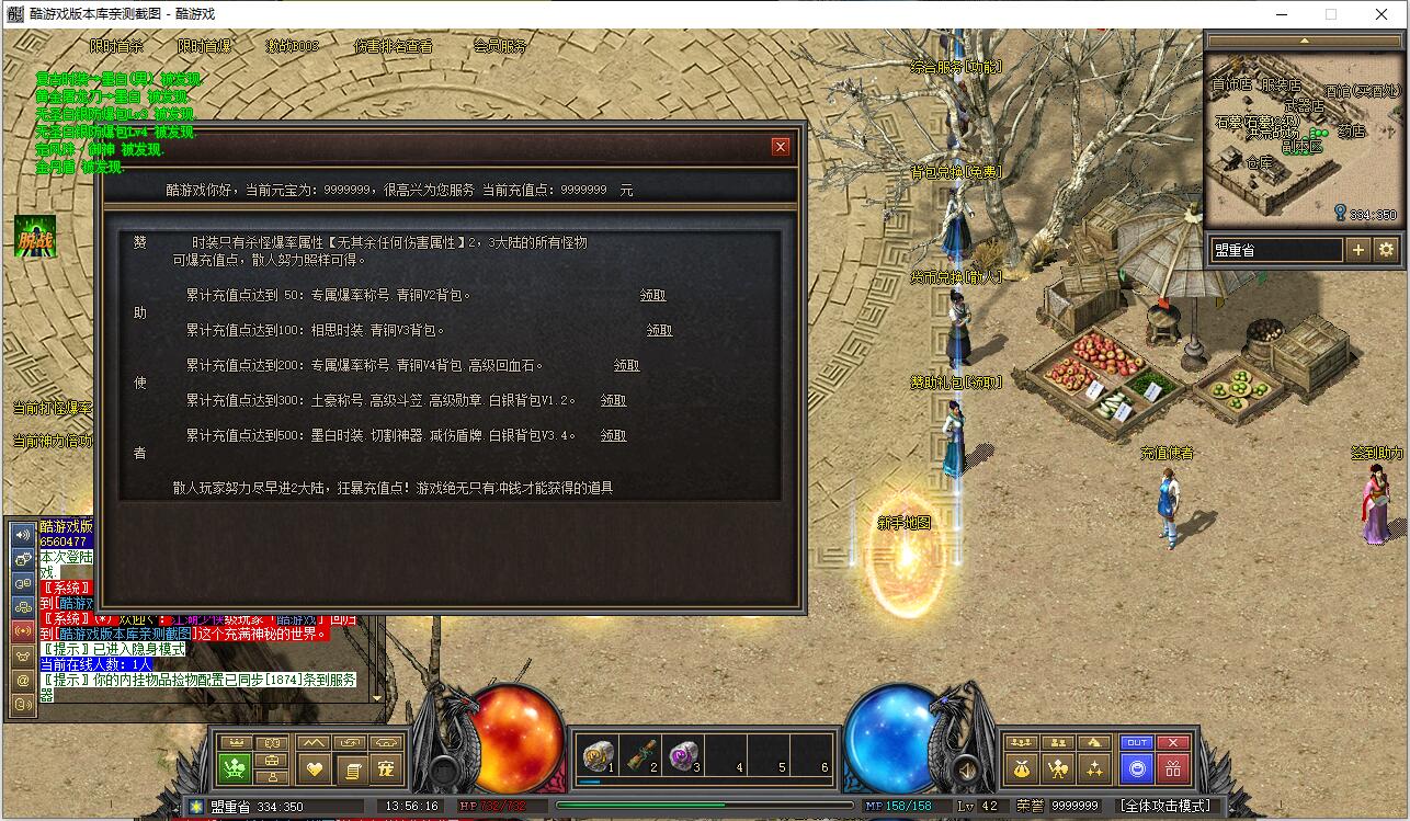 早期负重卖药火爆地带的NPC添加了负重卖药的功能,合成师可合成早期40级职业装。添加了盟重药店攻击神水任务和比奇武器店双倍卷轴任务。