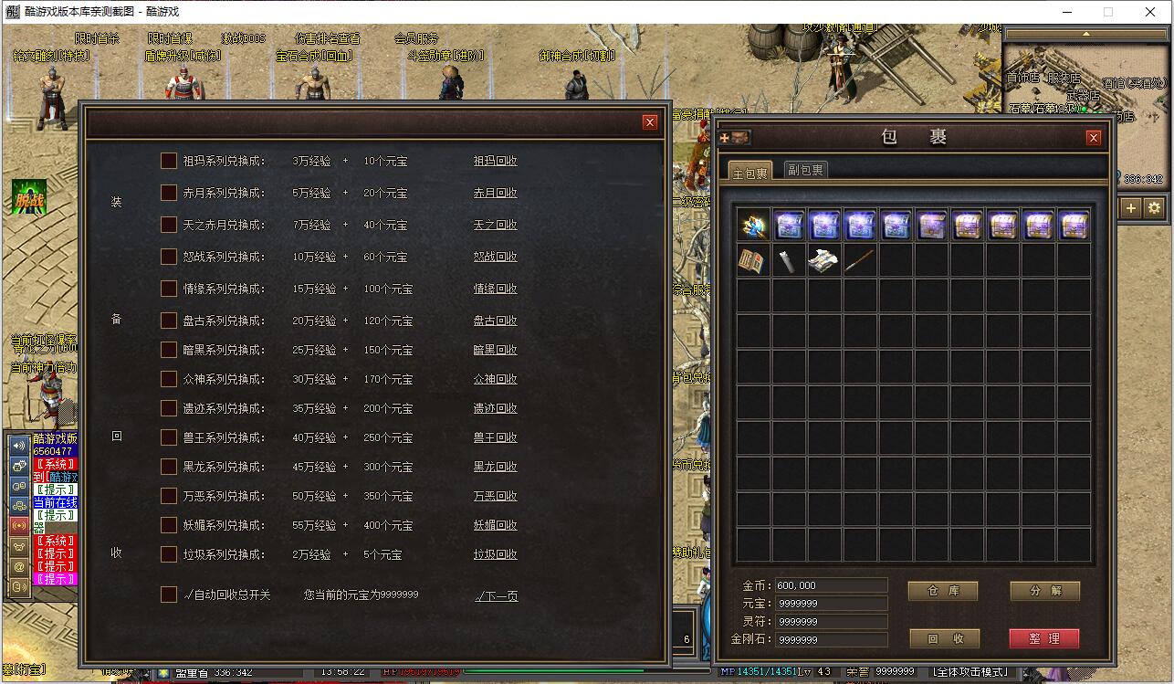 金币的用处很多,比如买药,买卷轴,买装备,修理装备使用传送服务等等。金币可以通过割肉,挖矿,打怪,做任务,到土城首饰店的回收商人用装备物品等换取金币。