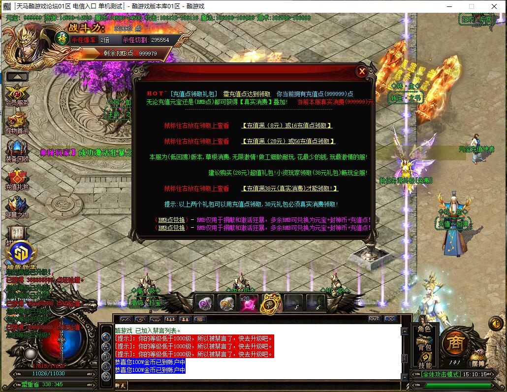 小白玩家:刷元宝抢上古神兽世界boss(爆高伤装备),做诛仙任务等战力500万以上,去散人福利和恐怖打宝(每怪50-60万元宝),转生升称号后下朝歌。注意:光柱装备勿回收,用于合神阁(如盟重需100-300光柱装备各8件)。