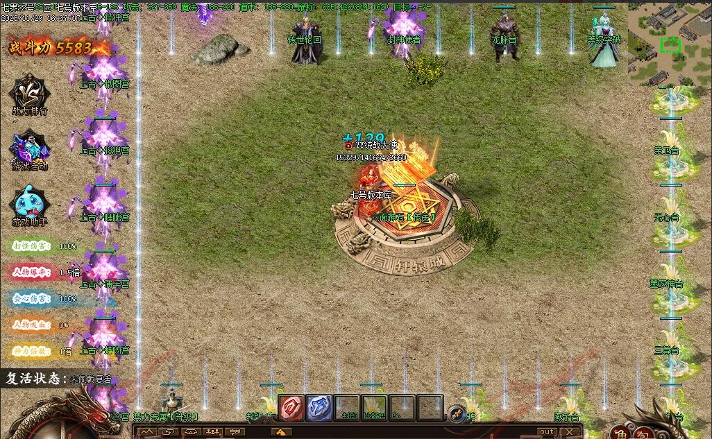 - 首先进捐献地图,直接撸1000W以下的所有怪,限时出的杠杠的,有了一定的基础装备,建议进入称号地图和转生地图,称号地图就进前面2个,转生地图5转和10转,这两个地图刷完,就去第一大路,九天世界,100级就能进入,点击六面神石,优先进中原、苗疆、魔世、墨门地图,先打1000W的,怪好打爆率高。如果此时打怪有困难,可以在土城招募NPC那用元宝搞个好点的苗疆宝宝,带麻痹和冰冻,让你打怪无压力。