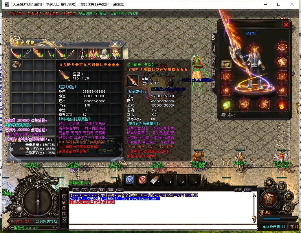 以上只是部分装备介绍。共计1500件特殊神器装备,全部靠打,任何BOSS都有几率爆出,一切看脸,无合成。