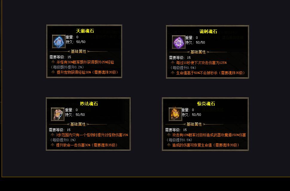 - 好运套装3件/武器+头盔+靴子 生命值.魔法值+5% 怪物掉落爆率+15%