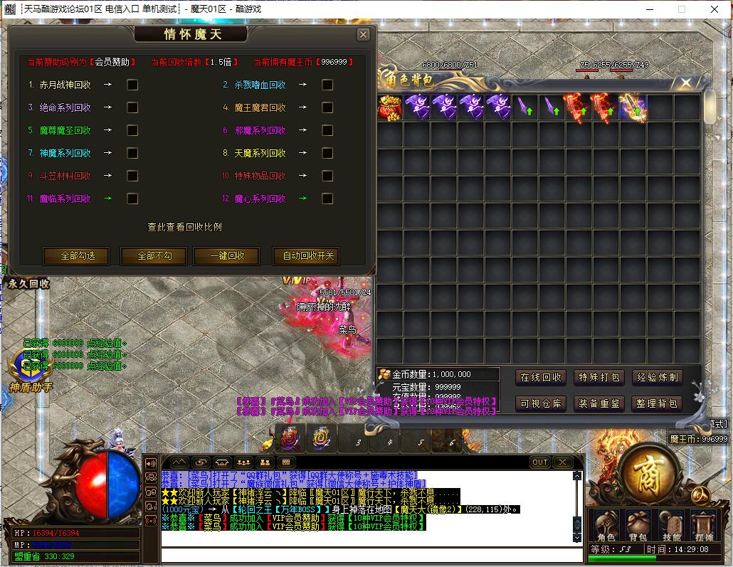 本服还原干净聊天框,无垃圾信息及回收提示,商铺不售材料全靠打怪,永久回收物品均由怪物爆出。游戏问题可QQ群联系客服完美解答,无论是否消费均用心服务,所有玩家公平对待。交易安全需通过商铺RMB点交易,提现手续费仅10%;私下交易一经查实封号并清除提现记录;禁止自动刷屏、骂人小号占安全区,违者警告或封号;严禁加速脱机外挂,发现必删永不解封。