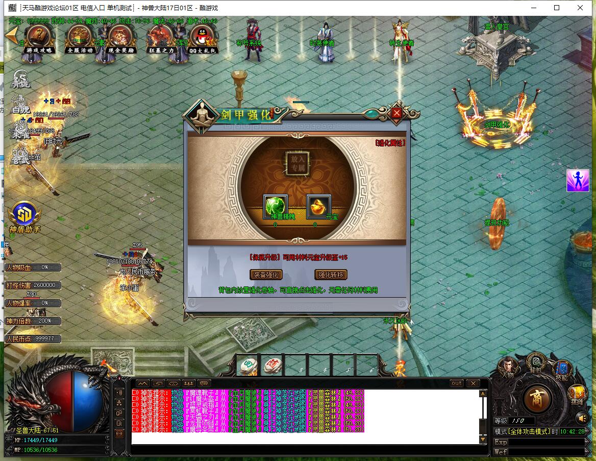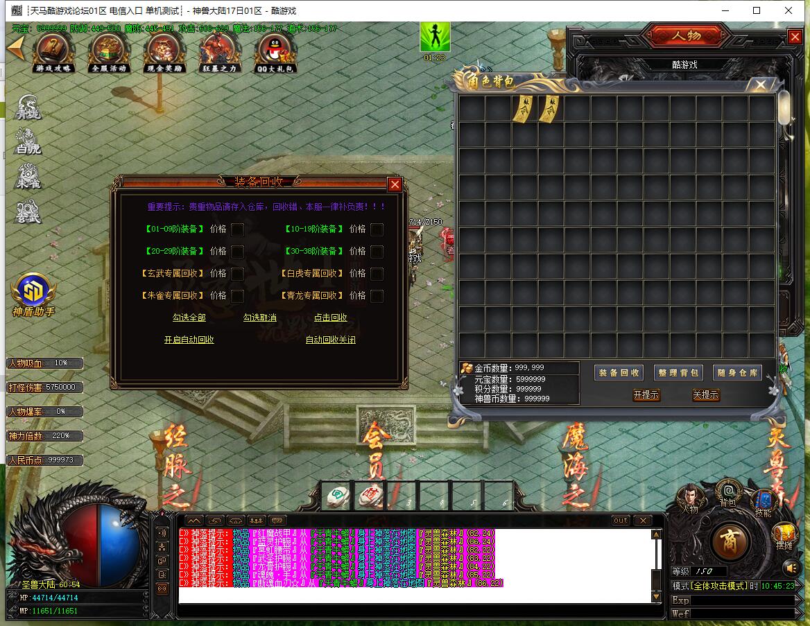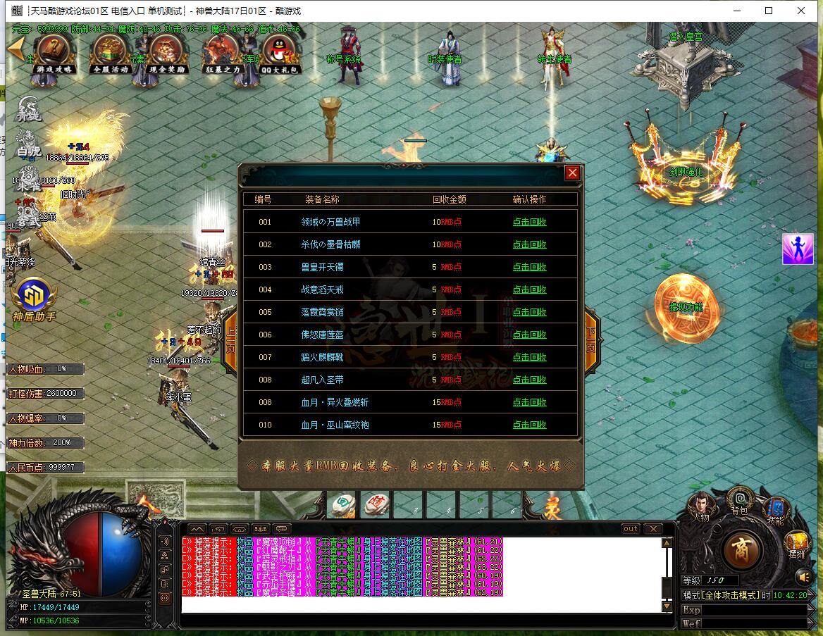 - 圣兽经脉:土城左上角合成,四大陆各7级,升满送顶级时装,3x3范围每秒切割2%血量。