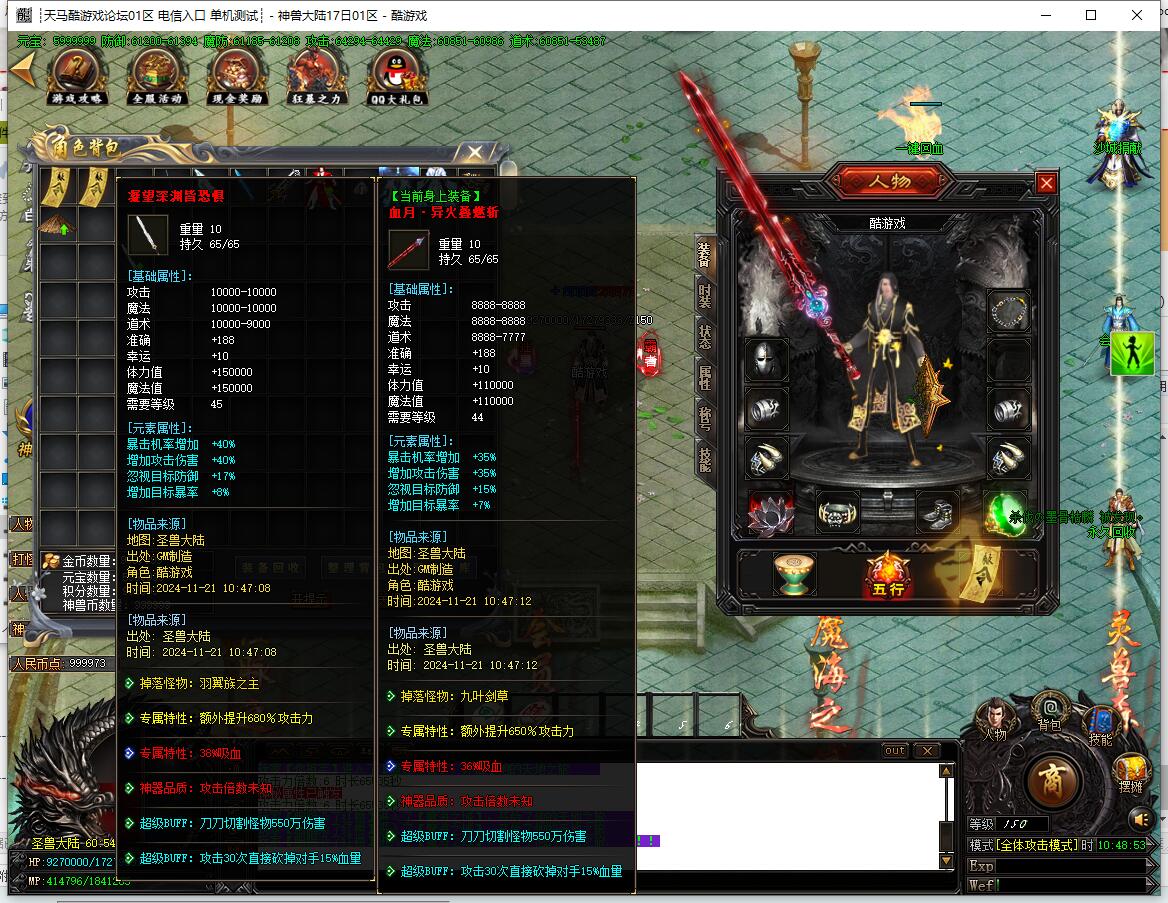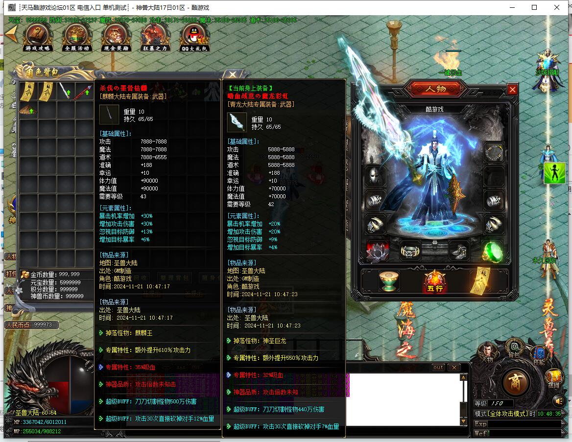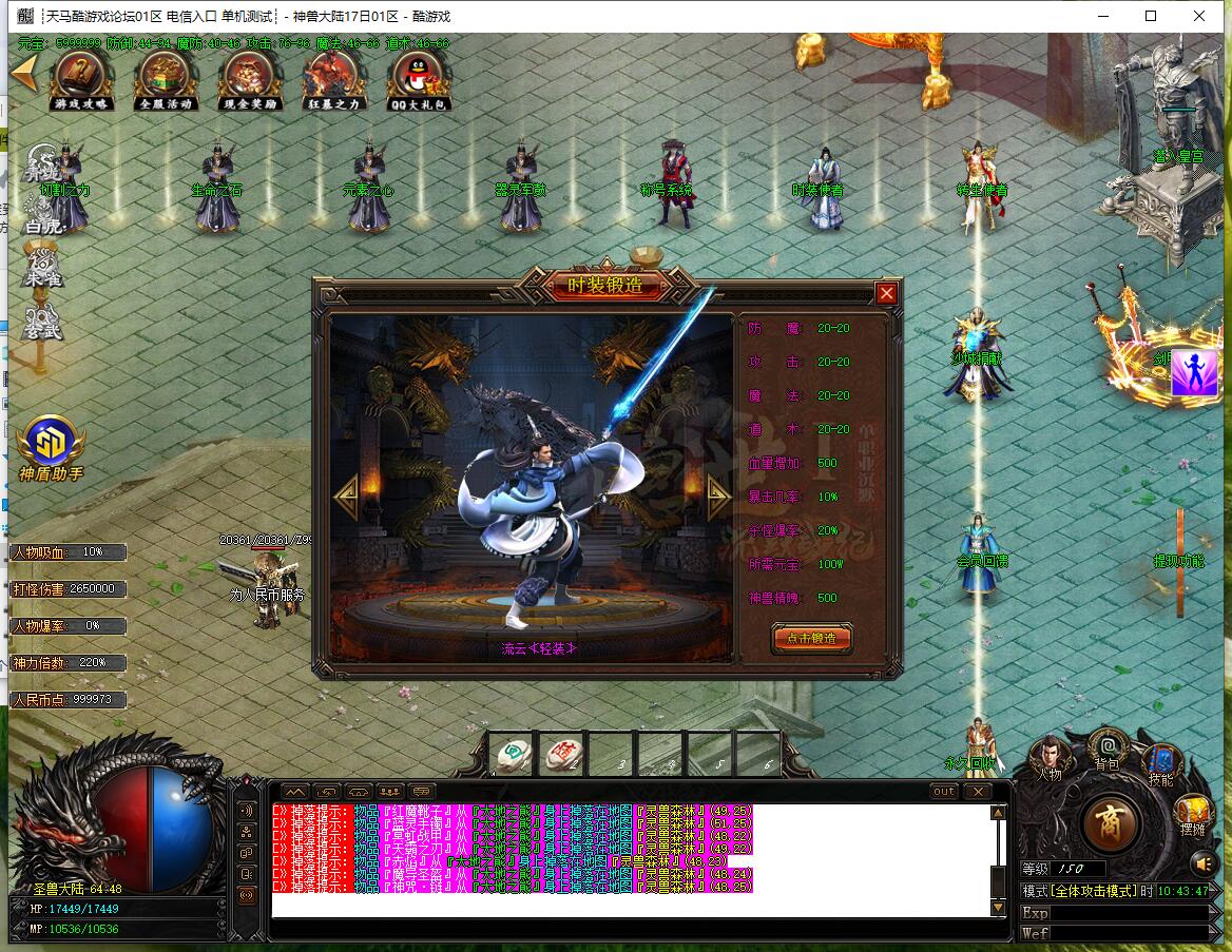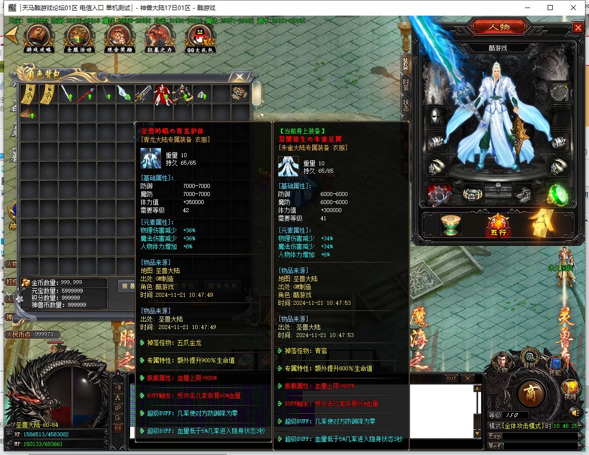 - 圣兽经脉:土城左上角合成,四大陆各7级,升满送顶级时装,3x3范围每秒切割2%血量。