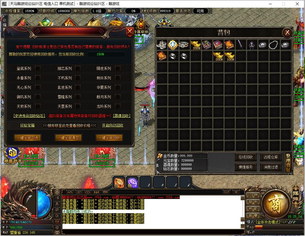 本服还原干净聊天框,无垃圾信息及回收提示,商铺不售材料全靠打怪,永久回收物品均由怪物爆出。游戏问题可QQ群联系客服完美解答,无论是否消费均用心服务,所有玩家公平对待。交易安全需通过商铺RMB点交易,提现手续费仅10%;私下交易一经查实封号并清除提现记录;禁止自动刷屏、骂人小号占安全区,违者警告或封号;严禁加速脱机外挂,发现必删永不解封。