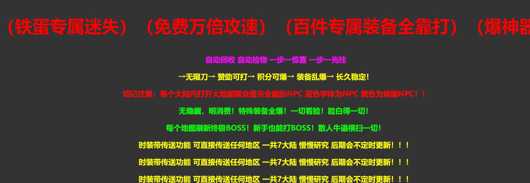欢迎来到传奇世界!享受自动回收与自动捡物的便捷,每一步都有惊喜,伴随炫目光柱效果。无限刀系统让你畅享战斗乐趣,赞助可解锁高级内容,积分可爆装备,装备乱爆,游戏长久稳定!切记:每个大陆内打开大地图,全图NPC一目了然——蓝色字体为普通NPC,黄色为地图NPC!无隐藏消费,明明白白!特殊装备全爆,一切看脸,脸白得一切!每个地图刷新终极BOSS,新手也能轻松挑战,散人玩家横扫一切!时装带传送功能,可直接传送任何地区,共7大陆等你探索,后期会不定时更新新内容!