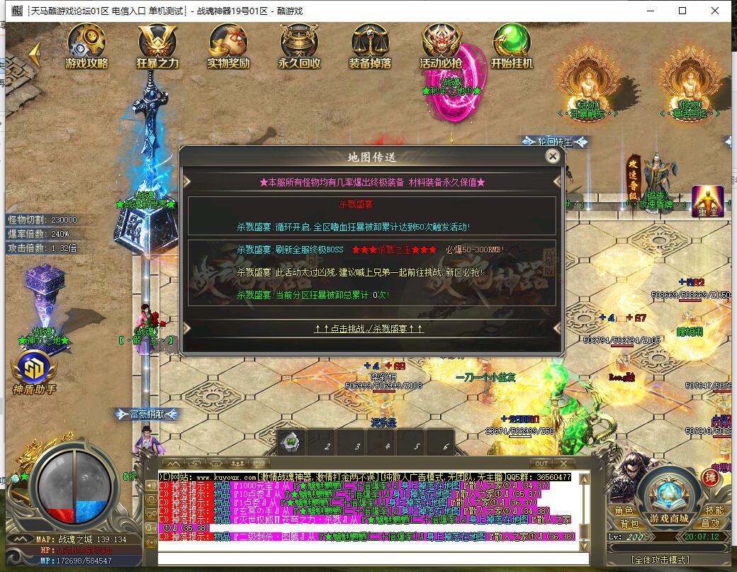 300元宝充值(实际冲200,官网充值系统多送50%):终极鞭尸,3大陆专属地图,(注意:奖牌免费解封此地图)可转新区50%充值
